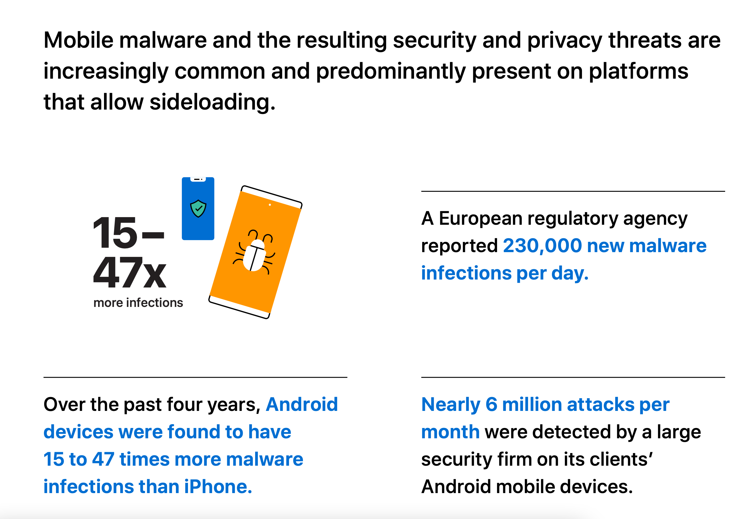 เมื่อเดือน ต.ค. ที่ผ่านมา Apple ได้แชร์ข้อมูลเกี่ยวกับความปลอดภัยและความส่วนตัวระหว่าง iPhone และสมาร์ตโฟนระบบ Android ว่า สมาร์ตโฟนระบบ Android ถูกโจมตีด้วย malware มากกว่า iPhone ระหว่าง 15 ถึง 47 เท่า ซึ่งส่วนหนึ่งมาจาก sideloading