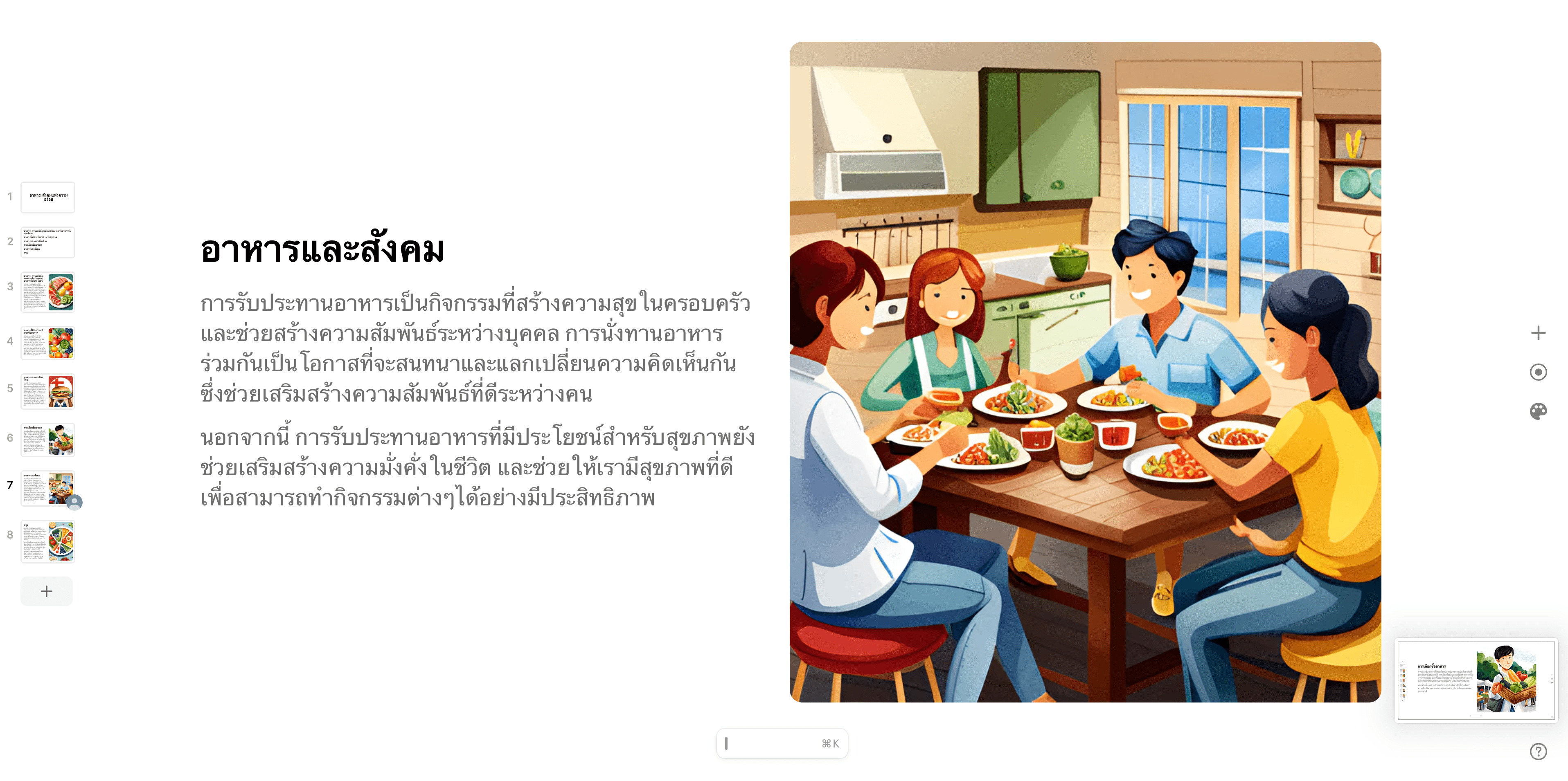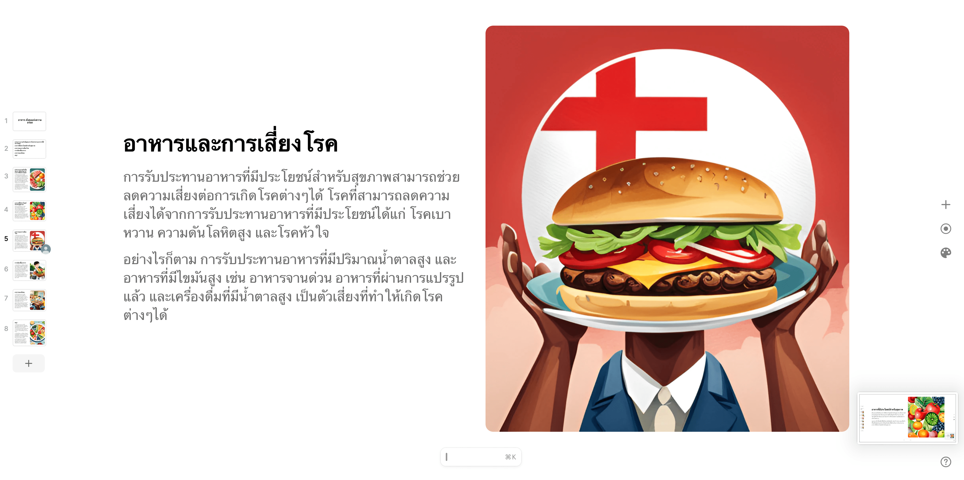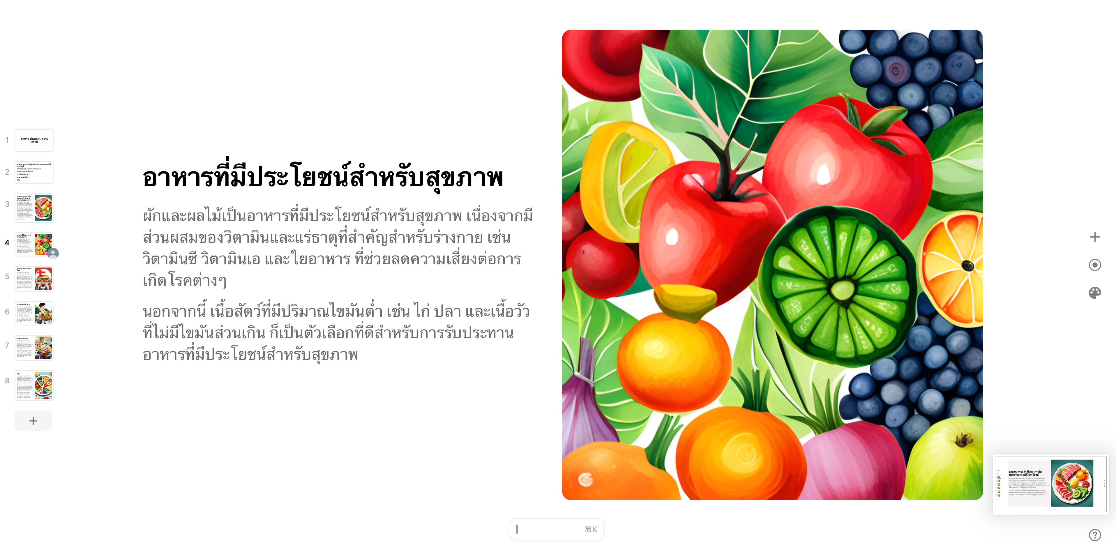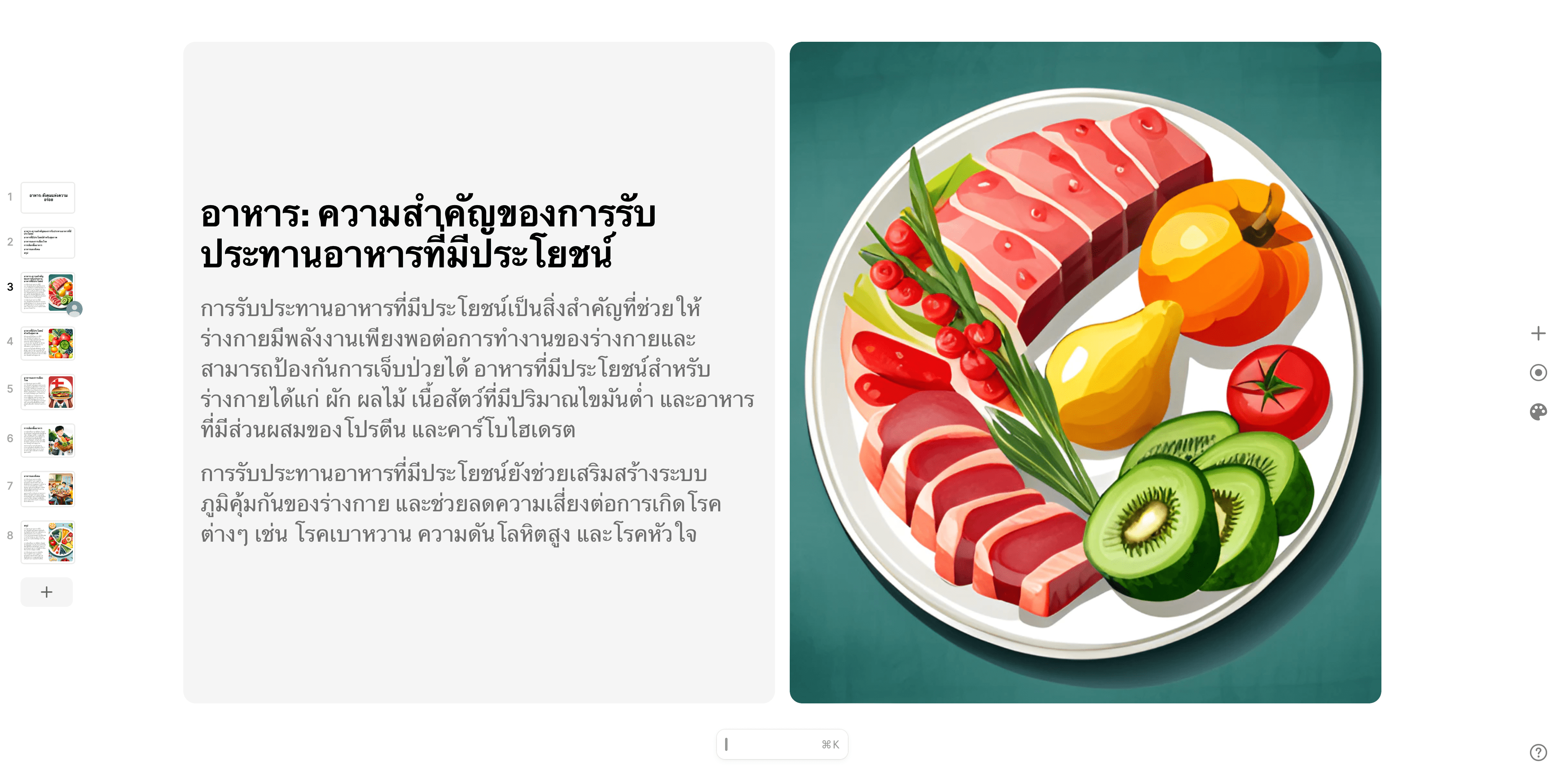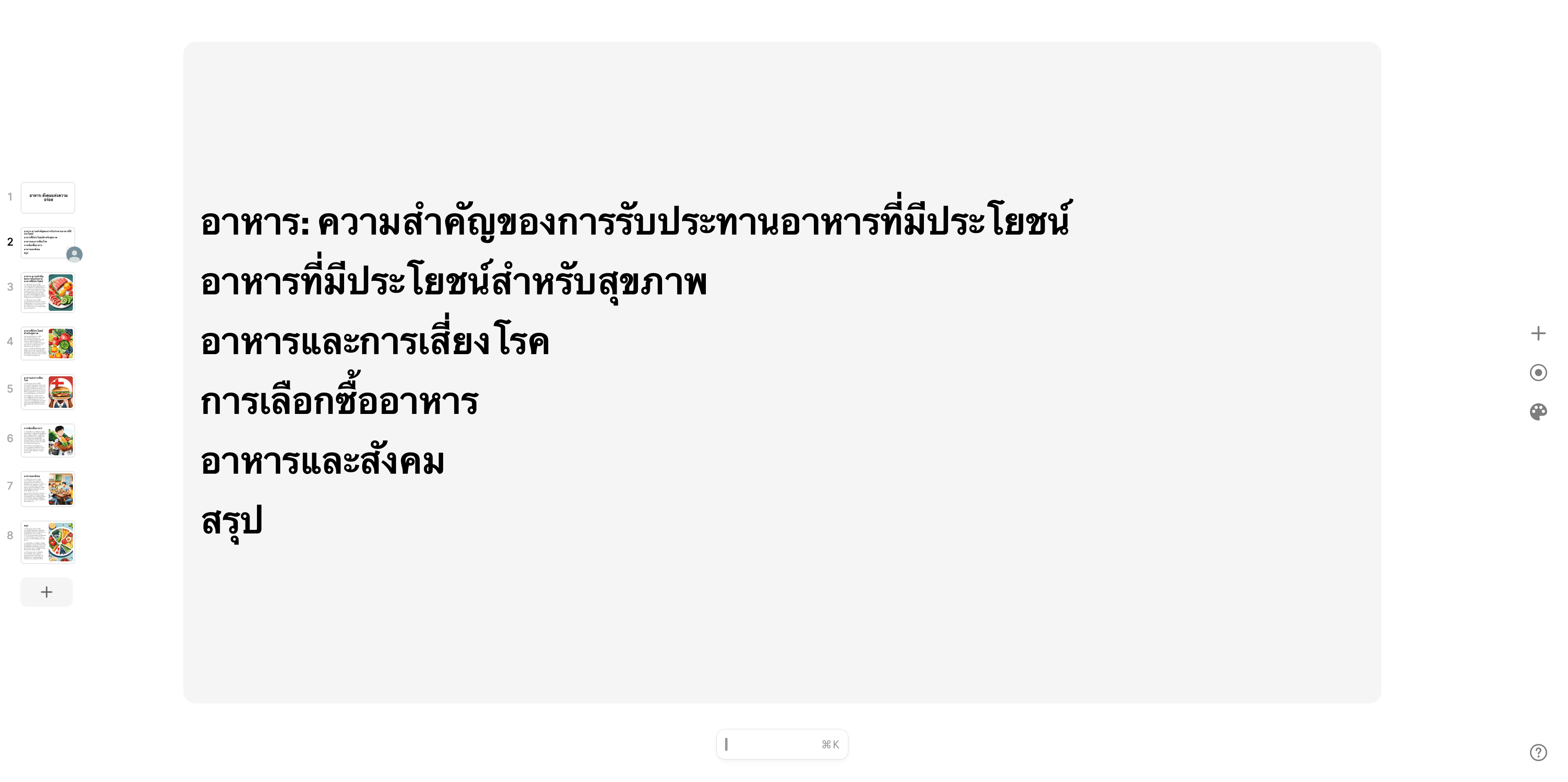 ภายในไม่กี่นาทีเราก็จะได้สไลด์แบบสำเร็จรูปออกมาอย่างรวดเร็วแบบในตัวอย่างที่ทีมงานได้ทำเลย แถมยังมีภาพประกอบสวยงามจาก AI อีกด้วย