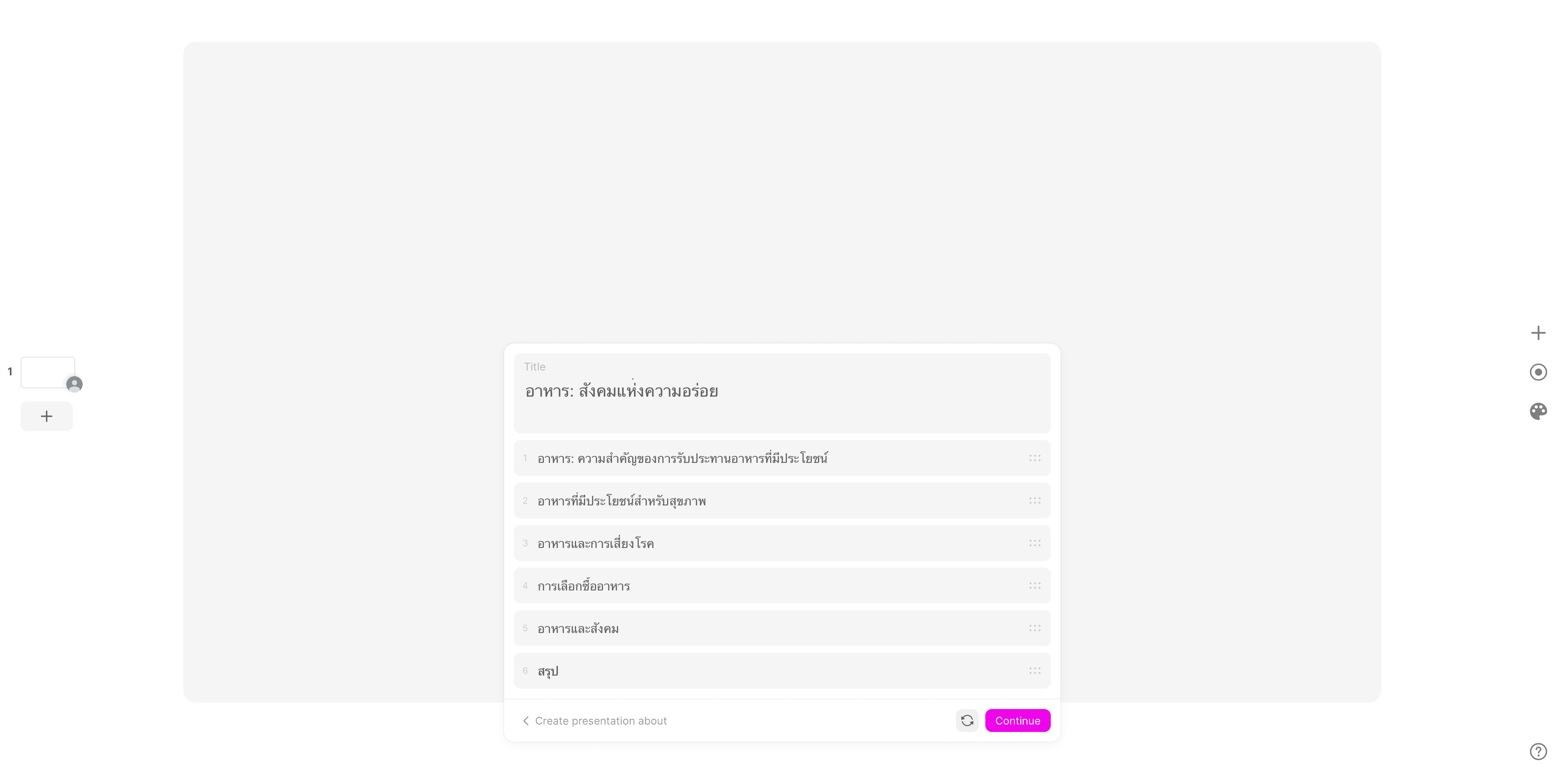 หลังจากพิมเรื่องเสร็จแล้ว หน้าเว็บจะประมวลผลออกมา ว่ามีหัวข้อไหนบ้างแบบอัตโนมัติ ซึ่งเราสามารถพิมหัวข้อใหม่ในสไลด์ได้หากไม่ถูกใจ พอเลือกได้แล้วว่าจะเอาหัวข้ออะไรบ้างในสไลด์เสร็จ ให้กด “Continue” เพื่อรอระบบประมวลสไลด์ของเราออกมา
