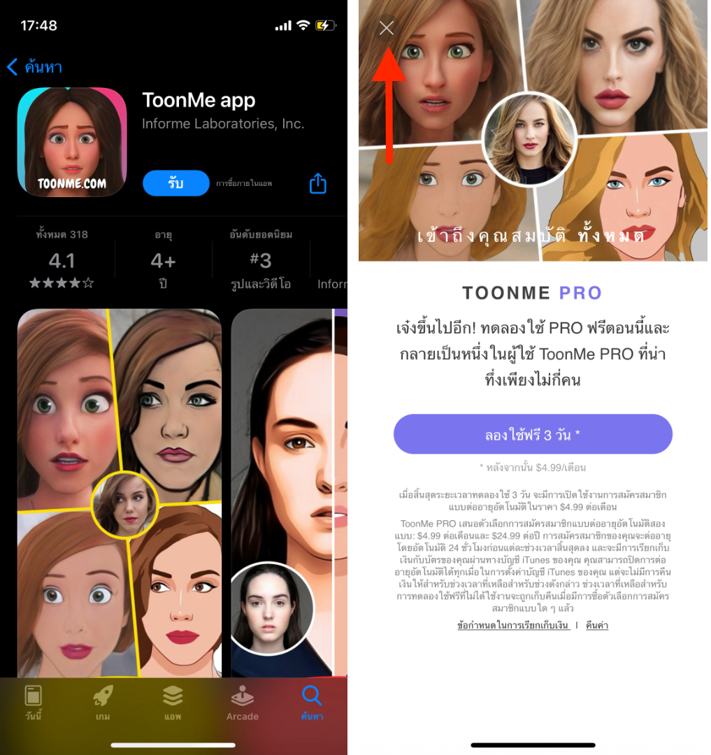เมื่อกดเข้ามาในแอป แอปจะถามการสมัครสมาชิกเป็นแบบ Pro > ให้แตะเครื่องหมายกากบาทด้านบนซ้าย