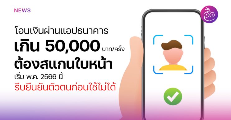 การำธุรกรรมโอนเงินผ่านแอปธนาคาร หากยอดโอนเกิน 50,000 บาท/ครั้ง ต้องสแกนใบหน้า เพื่อป้องกันการโอนเงินโดยมิจฉาชีพ ใครยังไม่มีข้อมูลใบหน้ากับธนาคารต้องยืนยันตัวตนก่อน! เริ่ม พ.ค. 2566 นี้