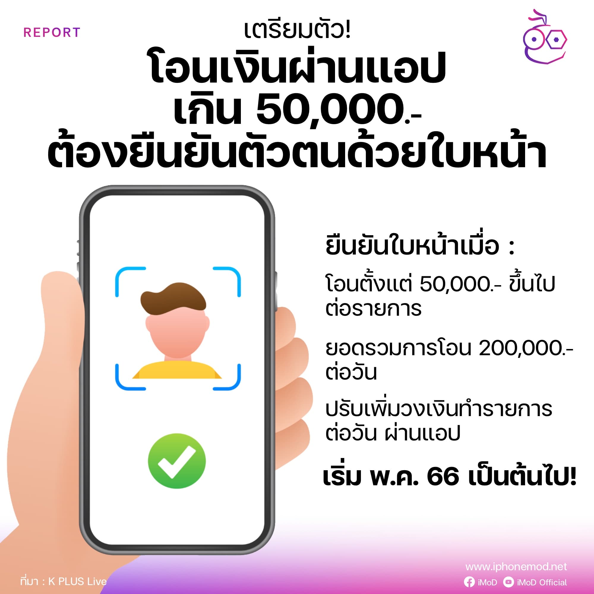 การำธุรกรรมโอนเงินผ่านแอปธนาคาร หากยอดโอนเกิน 50,000 บาท/ครั้ง ต้องสแกนใบหน้า เพื่อป้องกันการโอนเงินโดยมิจฉาชีพ ใครยังไม่มีข้อมูลใบหน้ากับธนาคารต้องยืนยันตัวตนก่อน! เริ่ม พ.ค. 2566 นี้