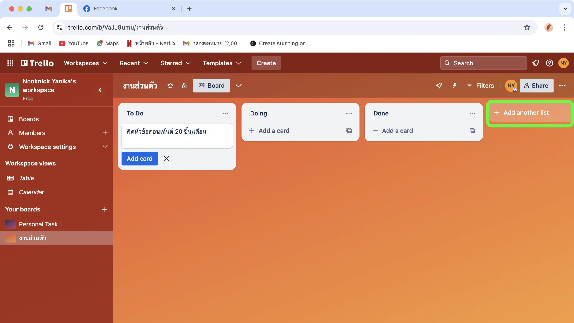 - เพิ่มรายการ โดยคลิกที่ปุ่ม “Add another list” เพื่อสร้างลิสต์แยกประประเภทกัน เช่น To Do (สิ่งที่ต้องทำ), Doing (กำลังทำ), และ Done (เสร็จแล้ว) โดยสามอย่างนี้เป็นพื้นฐานการใช้งาน Trello ที่ทุกคนควรรู้ หรือคุณจะเปลี่ยนชื่อรายการเป็นอย่างอื่นก็ได้ การแบ่งรายการแบบนี้ช่วยให้เห็นภาพรวมของงานได้ง่าย