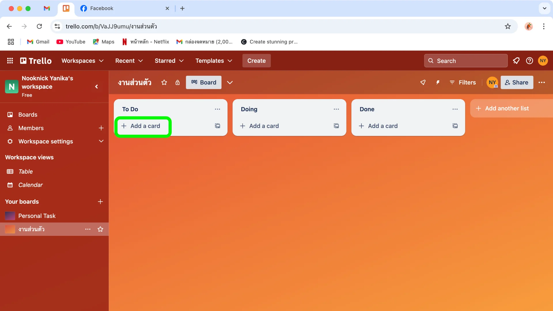 - คลิกที่ปุ่ม “+ Add a card” เพื่อเพิ่มงานในแต่ละรายการ