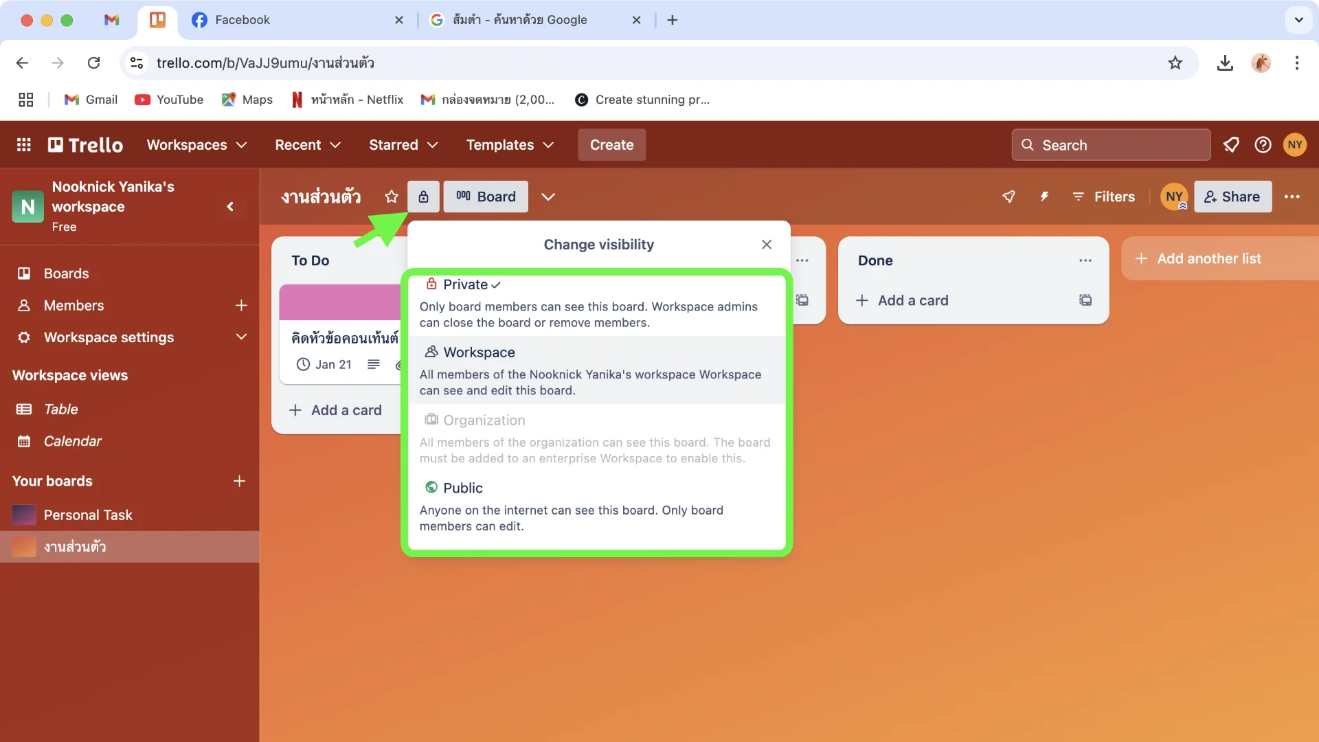 - ตั้งค่าความเป็นส่วนตัว โดยเลือกได้ว่าจะเป็นแบบ Private (ส่วนตัว) , Workplace (สำหรับใช้ในทีม) หรือแบบ Public (ไม่แนะนำ เพราะคนอื่นสามารถเข้ามาดูได้)