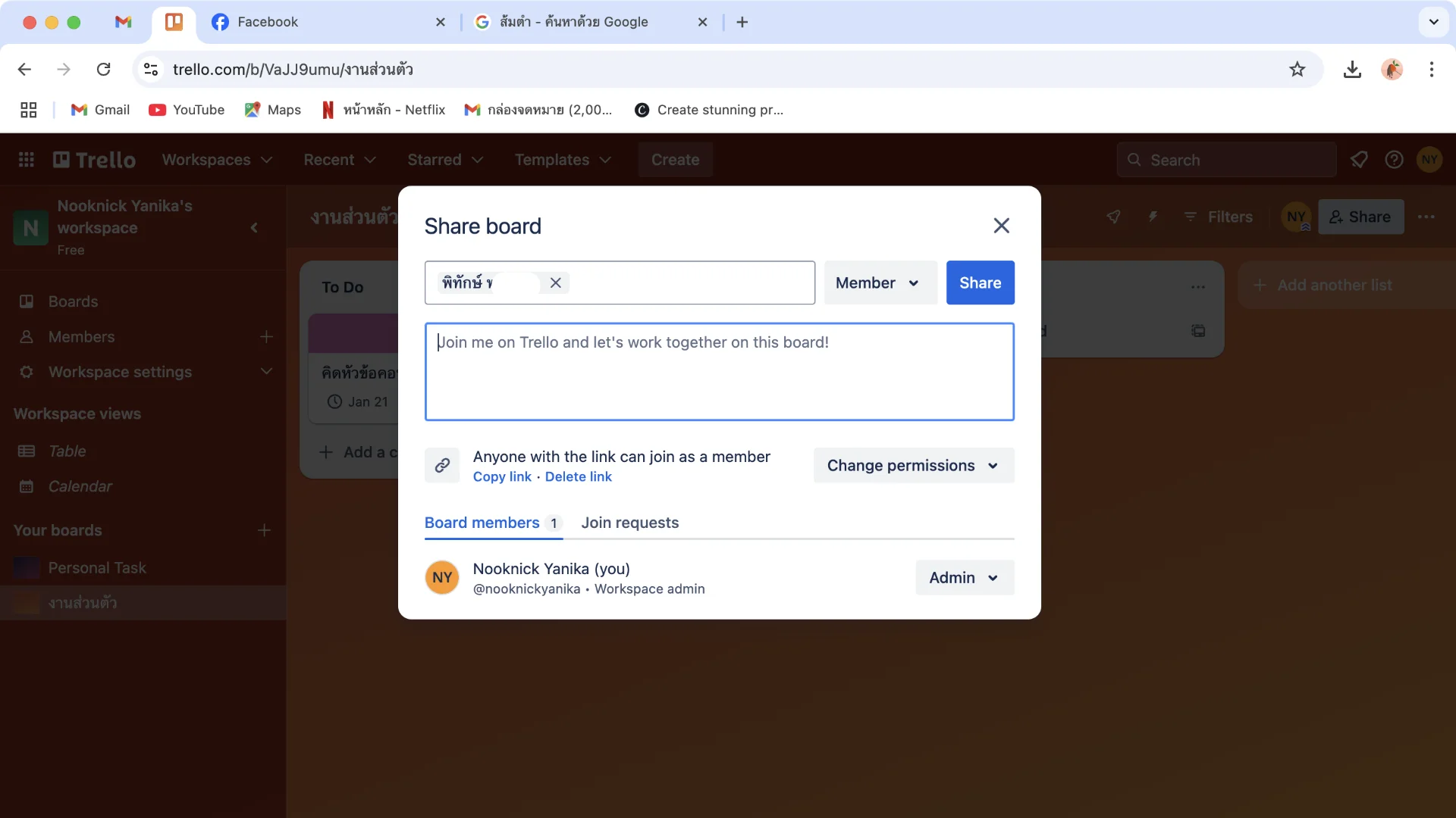 พิมพ์ชื่อหรือที่อยู่อีเมลของสมาชิกที่ต้องการเพิ่มลงไป แค่นี้ก็ชวนคนอื่นมาทำงานในบอร์ดเดียวกันได้เลย!