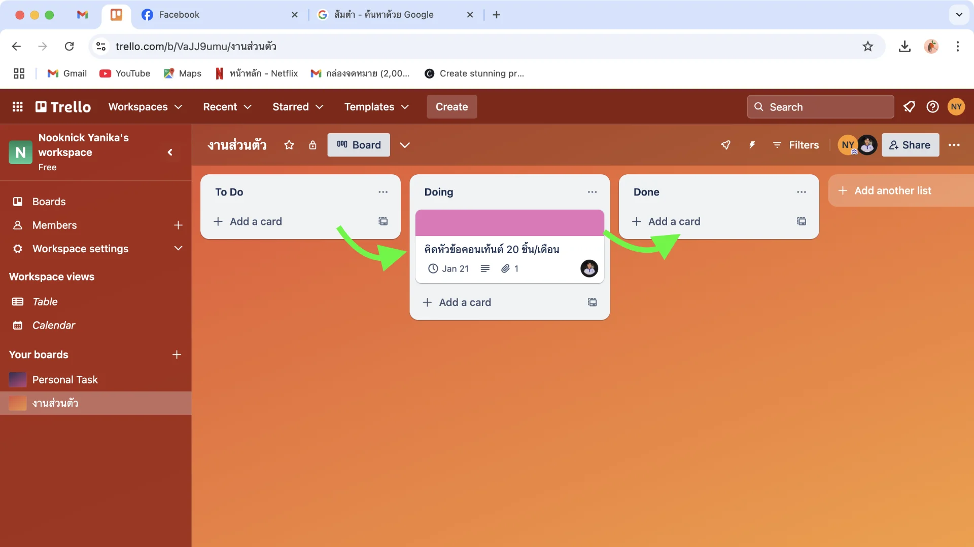 งานไหนที่เสร็จแล้ว สามารถลากการ์ดเพื่อเปลี่ยนตำแหน่ง และลากข้าม list ได้ เพื่อบอกให้คนอื่นหรือตัวเองรู้ว่า งานนี้ที่คุณกำลังทำอยู่ในขั้นตอนไหนแล้ว เช่น กำลังทำ หรือทำเสร็จแล้ว