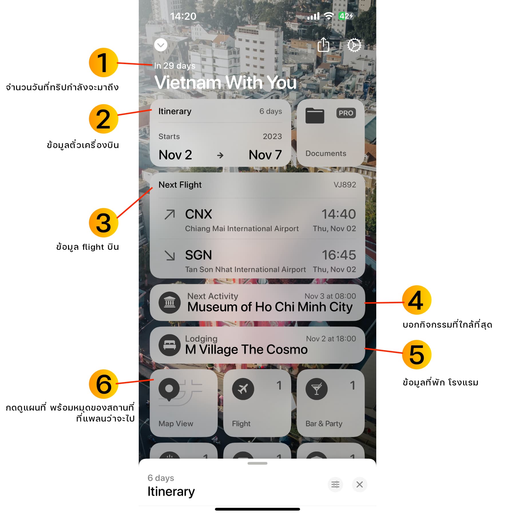 ในหน้านี้จะมีตั้งแต่ข้อมูล จำนวนวันที่ทริปกำลังจะเริ่ม ข้อมูลตั๋วเครื่องบิน ข้อมูลไฟล์ทบินที่บอกวันที่เวลาชัดเจน บอกกิจกรรมที่ใกล้ที่สุดที่กำลังจะมาถึง ข้อมูลที่พักหรือโรงแรม และเราสามารถกดดูแผนที่โดยรวม ดูหมดของสถานที่ที่เราจะไปได้