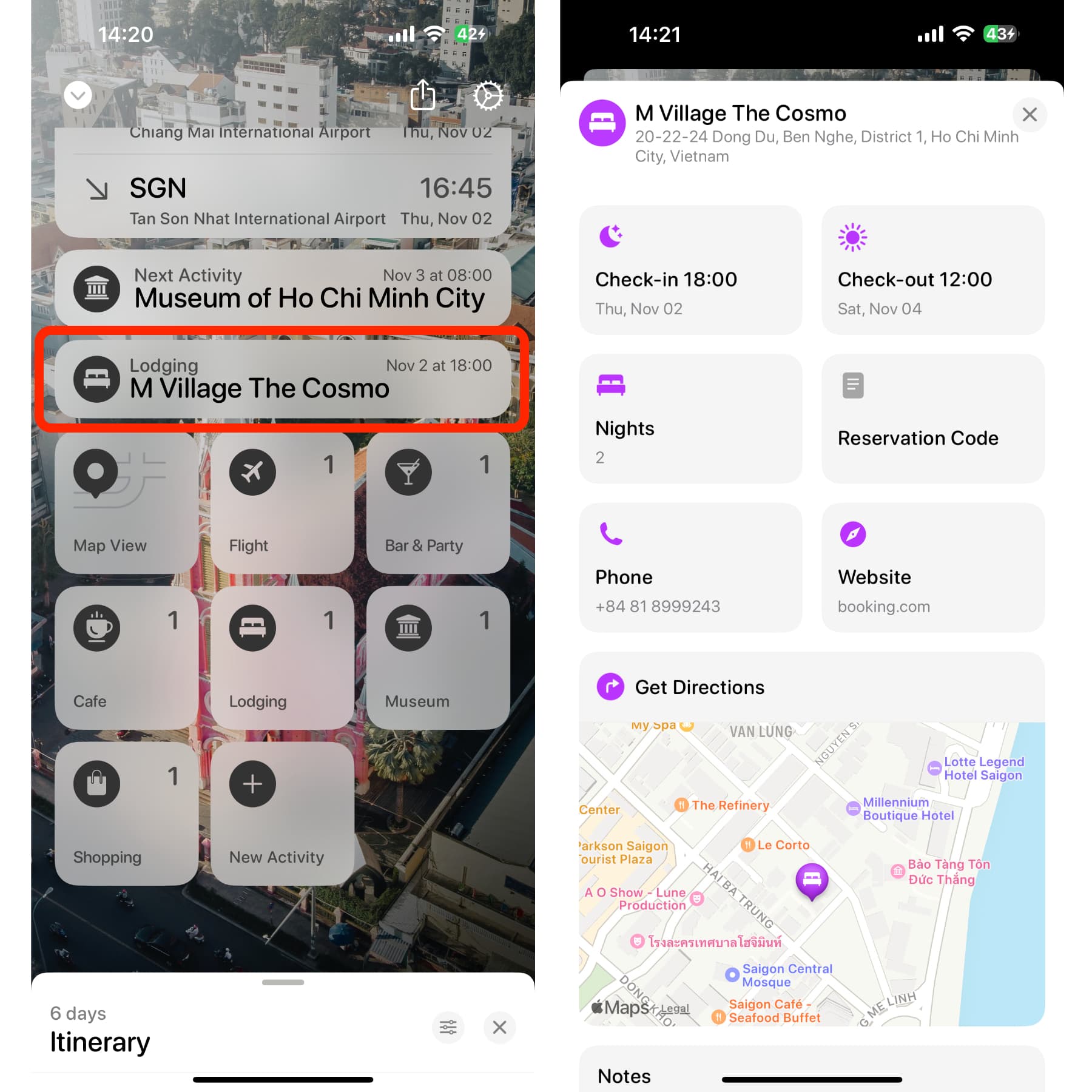 จะมีเวลาเช็คอิน เช็คเอาท์ (เวลาตามที่เราตั้งเอาไว้) บอกจำนวนคืนที่จะเข้าพัก มีข้อมูลเบอร์โทรติดต่อ และสามารถกดดูแผนที่เพื่อใช้เดินทางไปยังที่พักของเราได้