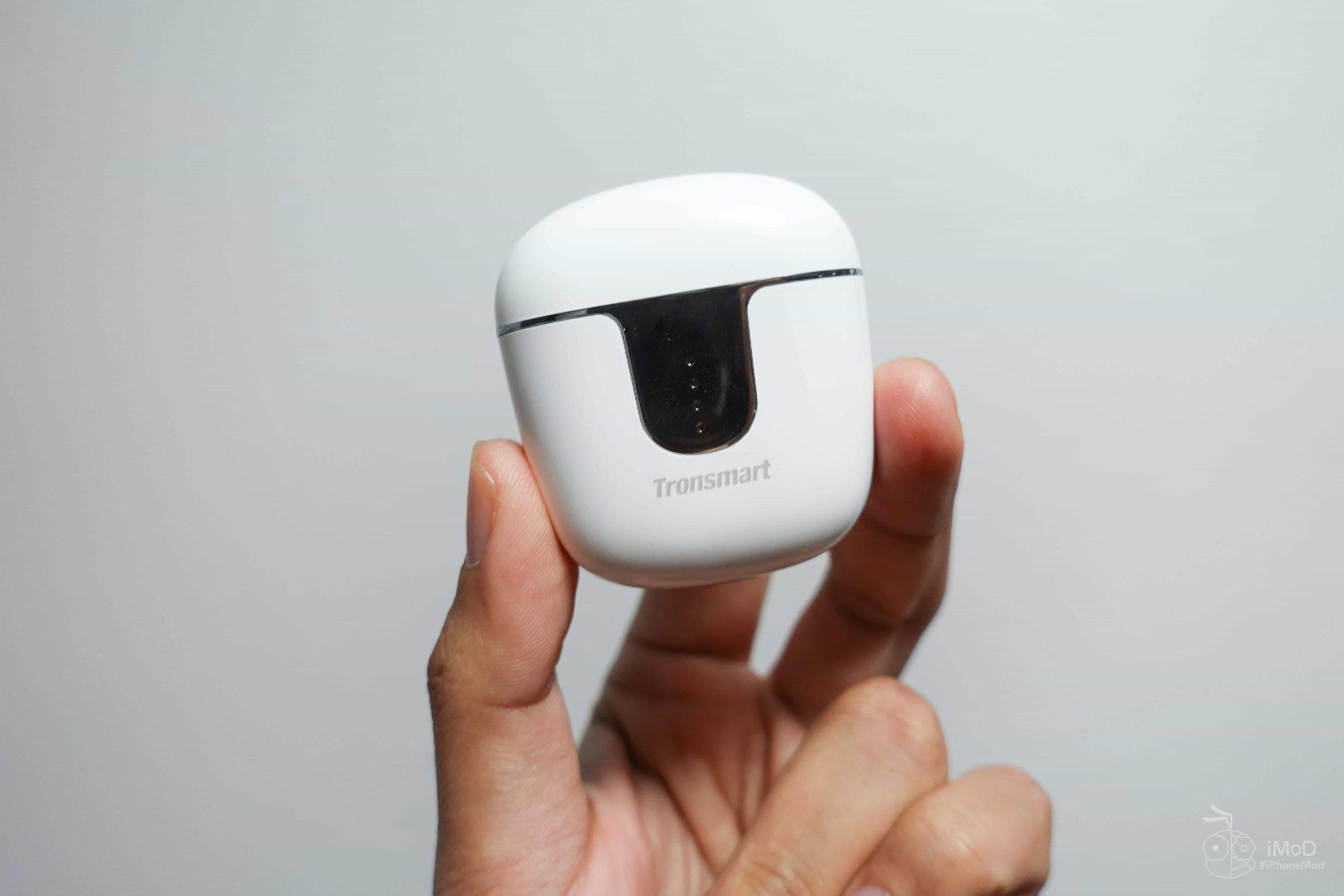 ก่อนอื่นเรามาดูที่เคสชาร์จกันก่อน โดยเคสชาร์จของ Tronsmart Onyx Ace มีขนาดไม่ใหญ่มาก สามารถพกพาได้สะดวก สวยงามด้วยกรอบสีเงินและไฟบอกสถานะความจุแบต