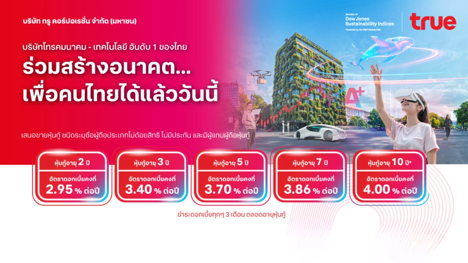 หุ้นกู้ TRUE ชุดใหม่มีอายุระหว่าง 2 ปี ถึง 10 ปี เพื่อรองรับความต้องการของนักลงทุนทุกกลุ่ม จากการที่ธนาคารแห่งประเทศไทยได้มีการปรับลดอัตราดอกเบี้ยนนโยบายลง 0.25% จาก 2.50% เป็น 2.25% เมื่อวันที่ 16 ตุลาคม 2024 ที่ผ่านมา นอกจากนี้ดอกเบี้ยนโยบายยังมีแนวโน้มปรับตัวลดลงอย่างต่อเนื่อง การลงทุนในหุ้นกู้ TRUE ถือเป็นโอกาสให้ผู้ลงทุนได้รับผลตอบแทนคงที่ในระยะยาวได้