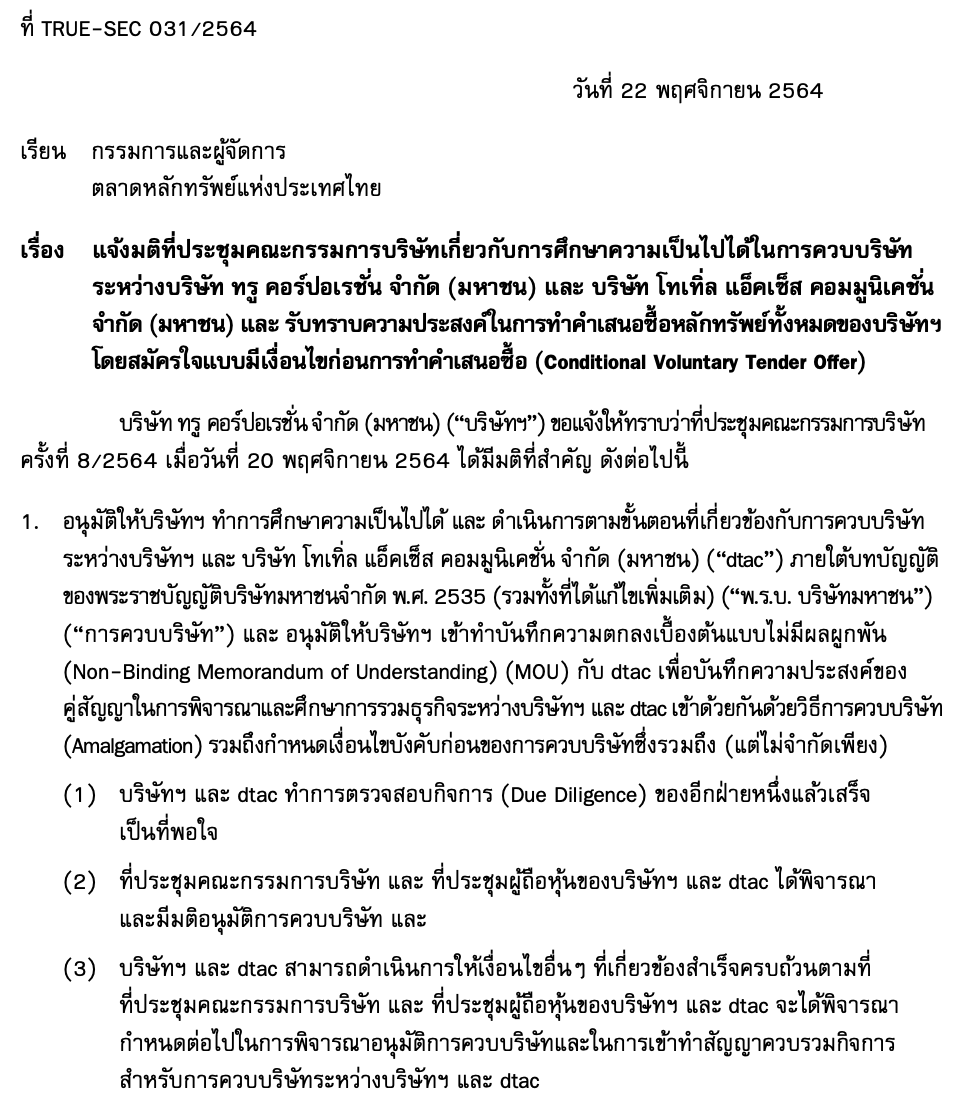 TRUE ได้เผยรายงานการประชุมคณะกรรมการบริษัทเมื่อวันที่ 20 พ.ย. 64 ที่ผ่านมา โดยใจความสำคัญเป็นการศึกษาความเป็นไปได้การควบรวมกิจการของ TRUE และ DTAC เข้าด้วยกัน