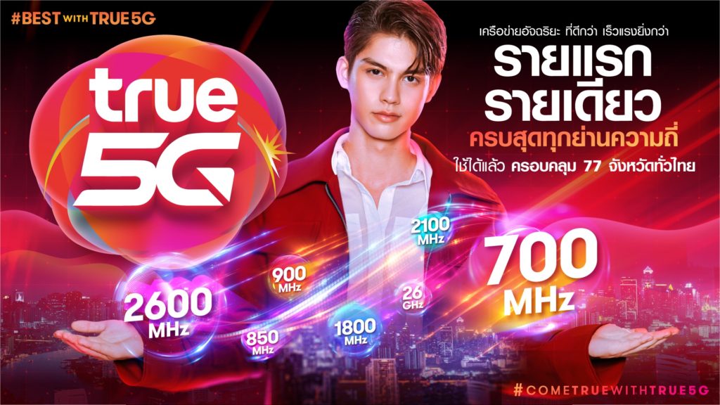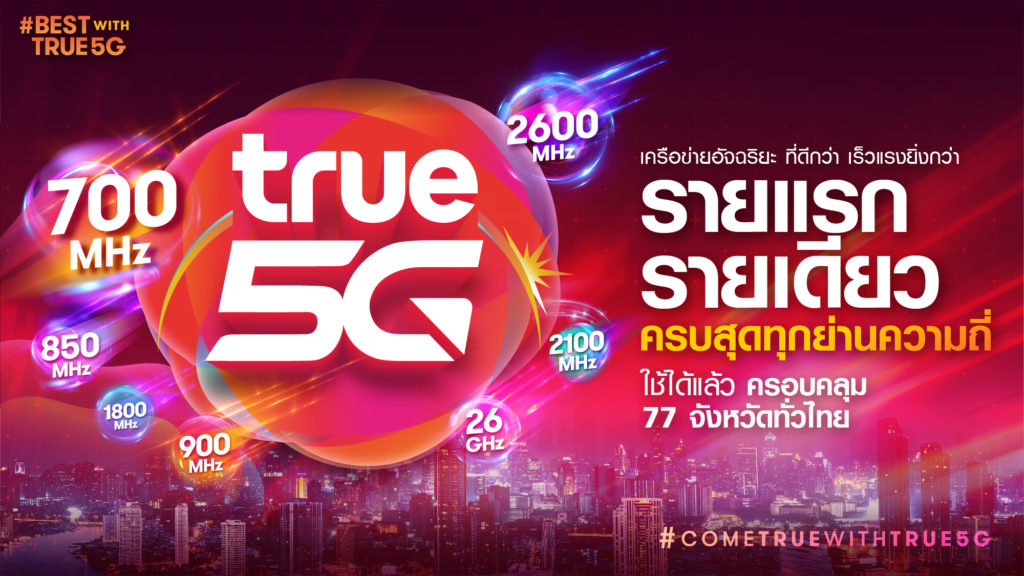 Come True with True 5G ยินดีต้อนรับเข้าสู่ชีวิตอัจฉริยะ กับทรู 5G เครือข่ายอัจฉริยะ ที่ดีกว่า เร็วแรงกว่า รายเดียว ที่ครบสุดทุกย่านความถี่ ใช้ได้ครบ 77 จังหวัด