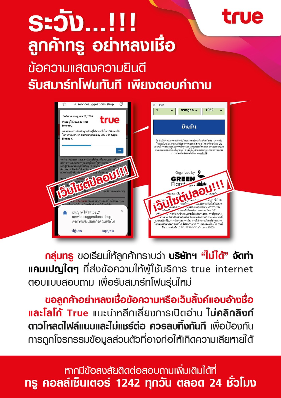 ทั้งนี้ก็ขอให้ลูกค้าอย่าหลงเชื่อข้อความหรือเว็บลิ้งค์แอบอ้างชื่อและโลโก้ True แนะนำหลีกเลี่ยงการเปิดอ่าน ไม่คลิกลิงก์ ดาวโหลดไฟล์แนบและไม่แชร์ต่อ ควรลบทิ้งทันที เพื่อป้องกันการถูกโจรกรรมข้อมูลส่วนตัวที่อาจก่อให้เกิดความเสียหายได้ หากมีข้อสงสัยติดต่อสอบถามเพิ่มเติมได้ที่ ทรู คอลล์เซ็นเตอร์ 1242 ทุกวันตลอด 24 ชั่วโมง