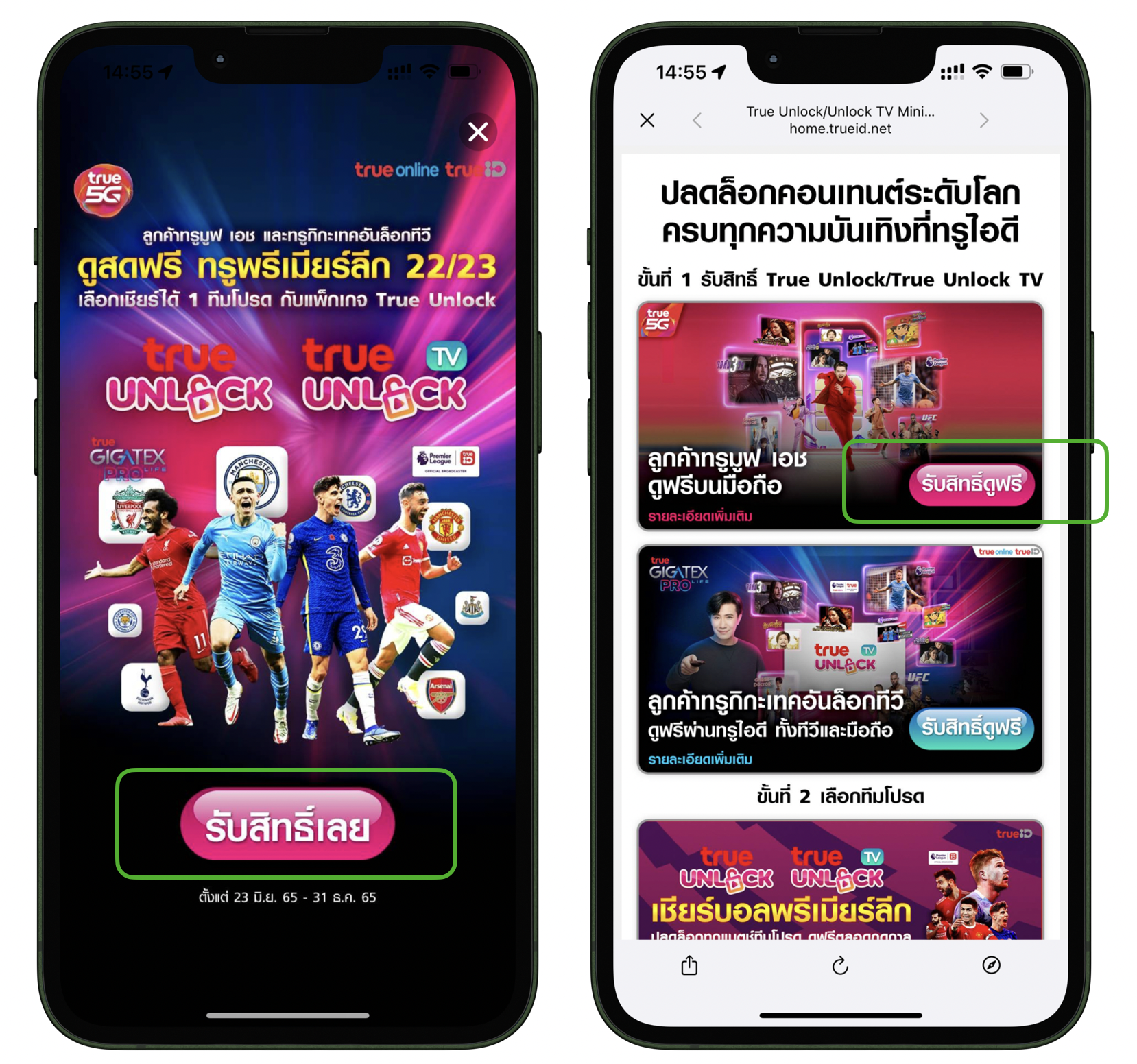 True Unlock ชม ทรู พรีเมียร์ลีก 1 ทีมโปรด ฟรี! สามารถรับสิทธิ์ได้ตั้งแต่วันนี้ – 30 ธ.ค. 65 เท่านั้น (ทรู พรีเมียร์ลีก ราคาปกติ 299 บาท)