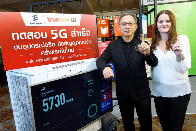 จากรูป: ทรูมูฟ เอชโดยนายอดิศักดิ์ ประสงค์ทรัพย์ (ที่ 2 จากขวา) หัวหน้าคณะผู้บริหาร ด้านปฏิบัติการโครงข่าย และนายพรรคพงษ์ อัคนิวรรณ (ที่ 2 จากซ้าย) หัวหน้าคณะผู้บริหาร ด้านเทคนิค-คุณภาพโครงข่าย บริษัท ทรู คอร์ปอเรชั่น จำกัด (มหาชน) ร่วมกับอีริคสัน โดย นางนาดีน อัลเลน (ขวา) ประธาน และนายอาเจย์ ชาร์มา (ซ้าย) รองประธาน บริษัท อิริคสัน (ประเทศไทย) จำกัด ประกาศความสำเร็จในการพัฒนาและทดสอบระบบส่งสัญญาณ 5G ต้นแบบสำเร็จเป็นรายแรกในไทย