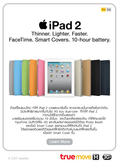 สำหรับลูกค้าของ Truemove ที่ต้องการสั่งซื้อหรือว่าท่านใดที่สนใจ iPad 2 สามารถเข้าไปชมรายละเอียดได้ที่ TrueMove H iPad
