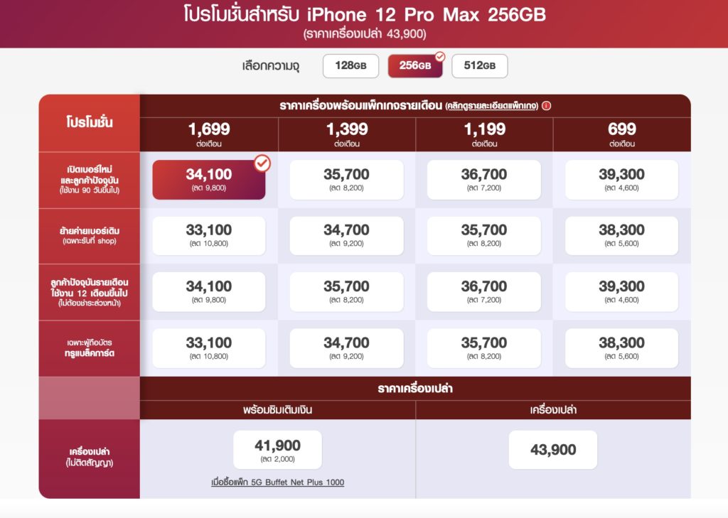 - iPhone 12 Pro Max 256GB – เริ่มต้น 33,100 บาท (เครื่องเปล่า 43,900 บาท)