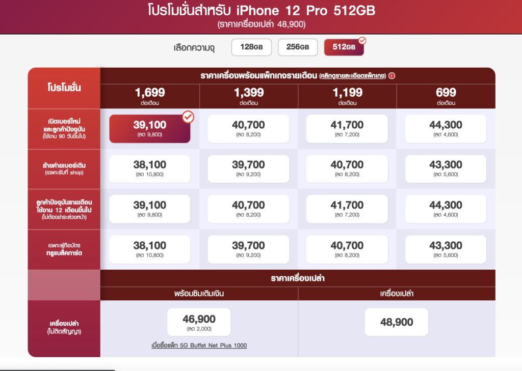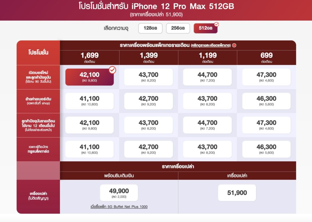 - iPhone 12 Pro Max 512GB – เริ่มต้น 41,100 บาท (เครื่องเปล่า 51,900 บาท)
