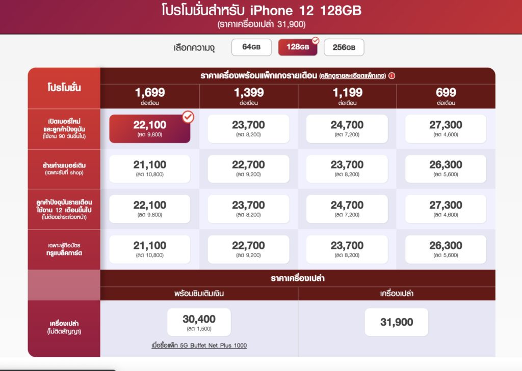 - iPhone 12 128GB – เริ่มต้น 21,100 บาท (เครื่องเปล่า 31,900 บาท)