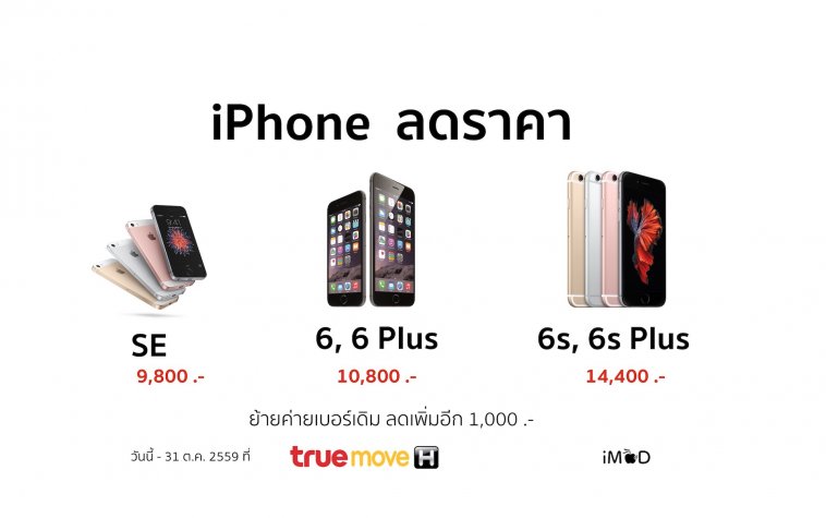 เพื่อต้อนรับการมาของ iPhone 7 ทางหลายเครือข่ายก็ได้กระตุ้นยอดขายอีกครั้งสำหรับไอโฟนรุ่นเก่า (จะเรียกว่าล้างสต๊อกก็ไม่ได้ เพราะทุกวันนี้ 5s ก็ยังมีขายอยู่) สำหรับลูกค้าย้ายค้ายมา TrueMove H ตอนนี้ก็มีราคาพิเศษ iPhone 6 เริ่มต้น 9,800 บาท(ลูกค้าย้ายค่ายเบอร์เดิม) ส่วน ลูกค้าเก่าก็ได้ในราคา 10,800 บาท นอกจากนี้ยังมี iPhone 6s อีกด้วยนะครับ