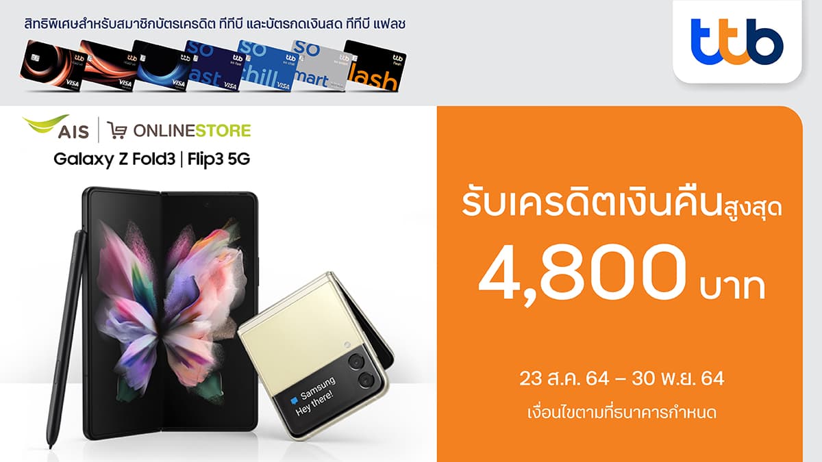 บัตรเครดิต ทีทีบี ร่วมมือกับเอไอเอส จัดเต็มความคุ้มค่าทุกการใช้จ่าย เมื่อซื้อโทรศัพท์มือถือ Samsung Galaxy Z Fold3 | Flip3 ที่ AIS Shop และ AIS Online Store รับสิทธิประโยชน์สุดคุ้ม 2 ต่อ รับเงินคืนสูงสุด 4,800 บาท ตั้งแต่วันนี้ ถึง 30 พฤศจิกายน 2564