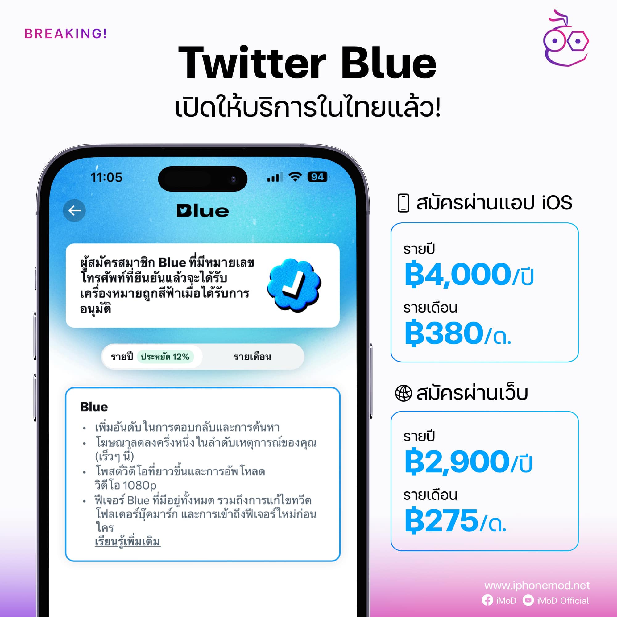 Twitter Blue เปิดให้บริการในไทยแล้ว! รายเดือน ฿380.- / รายปี ฿4,000.- ใช้งานฟีเจอร์ได้หลากหลายมากขึ้นกว่าบัญชี Twitter ปกติ