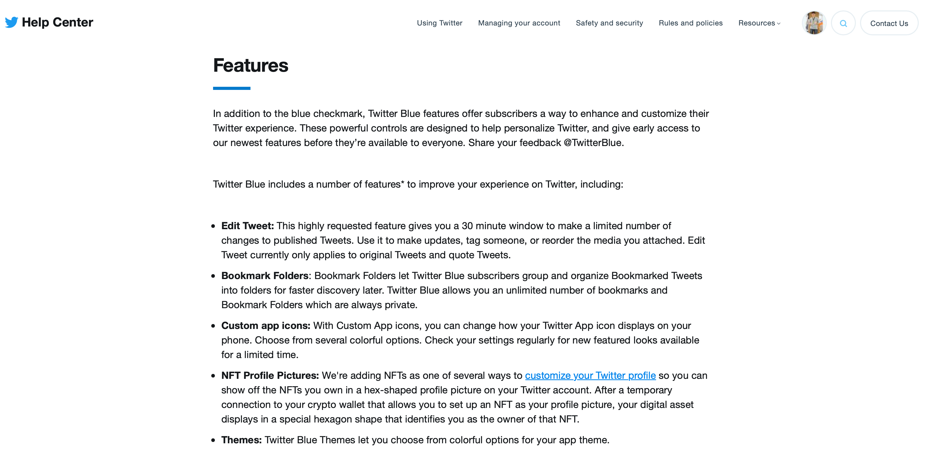 • ใช้ฟีเจอร์ Blue ทั้งหมดได้ แก้ทวีตได้ โฟลเดอร์ Bookmarks และเข้าถึงฟีเจอร์ใหม่ ๆ ก่อนใคร (เช่น ทวิตยาวขึ้น 4,000 อักษร, แก้ไขทวิตได้ 5 ครั้ง และ NFT)