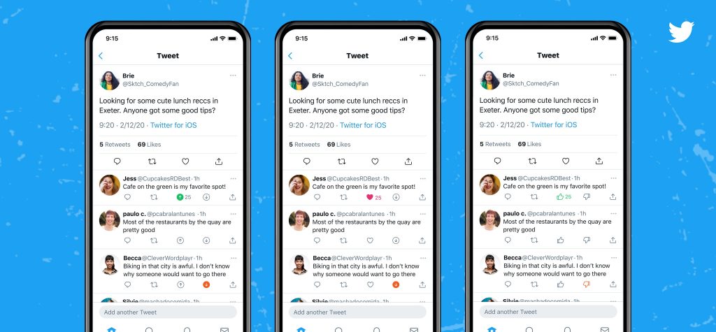 ปุ่ม Downvote ของ Twitter ไม่ใช่ปุ่ม Dislike จะแสดงอยู่ด้านล่างทวีตตอบกลับ ข้าง ๆ กับปุ่ม Like (หัวใจ)โดยปุ่มนี้จะเห็นได้เฉพาะเราเท่านั้น ไม่แสดงต่อสาธารณะ รวมถึงไม่แสดงต่อผู้เขียนทวีตด้วย สื่อให้เห็นว่าการกดปุ่ม Downvote นั้นออกแบบมาเพื่อช่วยให้ Twitter สามารถคัดกรองทวีตที่มีประโยชน์และเกี่ยวข้องกับการสนทนาภายในทวีต