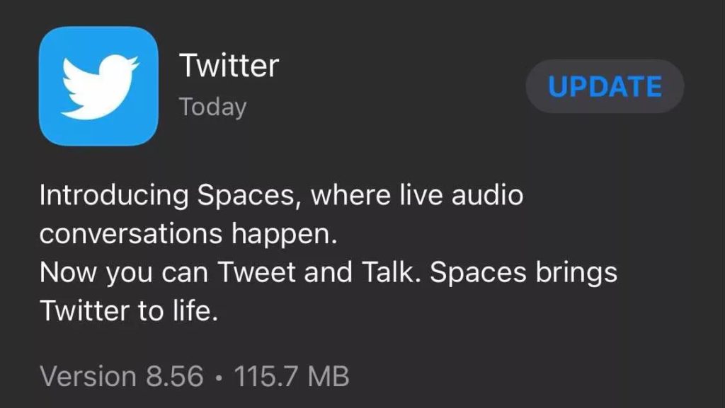 Twitter เผยว่าฟีเจอร์ Space จะปล่อยให้ผู้ใช้ทุกคนได้ใช้งานกันในเดือนเมษายนนี้ ฟีเจอร์นี้จะให้ผู้ใช้สร้างห้องแชทและเชิญให้ผู้อื่นเข้ามาร่วมเพื่อพูดคุยหรือเข้าฟังได้ โดยผู้พูดจะจำกัดอยู่ที่ 10 คน ส่วนผู้ฟังนั้นสามารถเข้ามาร่วมฟังในห้องได้ไม่จำกัดจำนวนคน