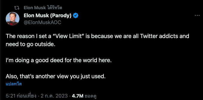 Elon Musk ไม่ได้บอกเหตุผลตรง ๆ ว่าเพราะอะไร แต่ได้รีทวีตจากบัญชีล้อเลียน “Elon Musk (Parody)” ที่เผยเหตุผลสำคัญ ที่ทำให้มีการจำกัดการดูทวีตต่อวันขึ้นมาก็เพื่อ “อยากให้คนที่เสพติด Twitter ออกไปทำอย่างอื่นบ้าง, สิ่งที่เขาทำก็เพื่อช่วยโลกใบนี้”