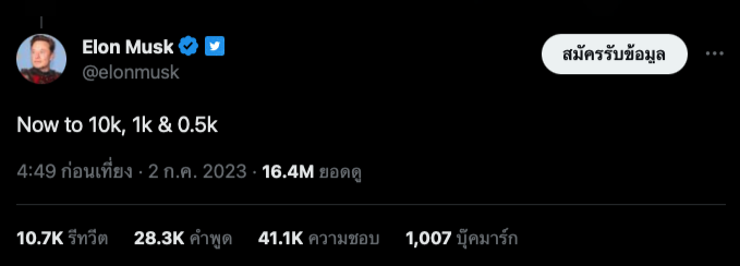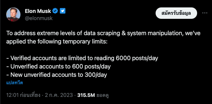 ชาวทวีตรับแรงกระแทกเต็ม ๆ Elon Musk ประกาศการจำกัดการดูทวีตต่อวัน บัญชี Verified ดูได้ 10,000 ทวีต/วัน, คนทั่วไปดูได้ 1,000 ทวีต/วัน และบัญชีใหม่ ดูได้ 500 ทวีต/วัน
