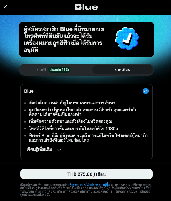 คนที่อยากไถดู Twitter 10,000 ทวีต/วัน ทำได้โดยการสมัคร Twitter Blue มีค่าบริการ 275 บาท/เดือน หรือ 2,900 บาท/ปี (ราคาโปรโมชันจาก 3,300 บาท/ปี)