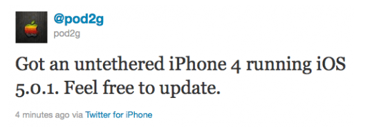 ซึ่งในตอนนี้นักพัฒนา Pod2g ได้ยืนยันแล้วว่าอุปกรณ์ที่ใช้ iOS 5.0.1 บนชิป A4 (ยกเว้น iPhone 4S/iPad 2) สามารถ Jailbreak แบบ Untethered ได้แล้ว สรุปก็คือ ผมแนะนำให้อัปเดตไปรอยัง iOS 5.0.1 กันได้เลยครับ ยกเว้น iPad 2 และ iPhone 4S นะครับ