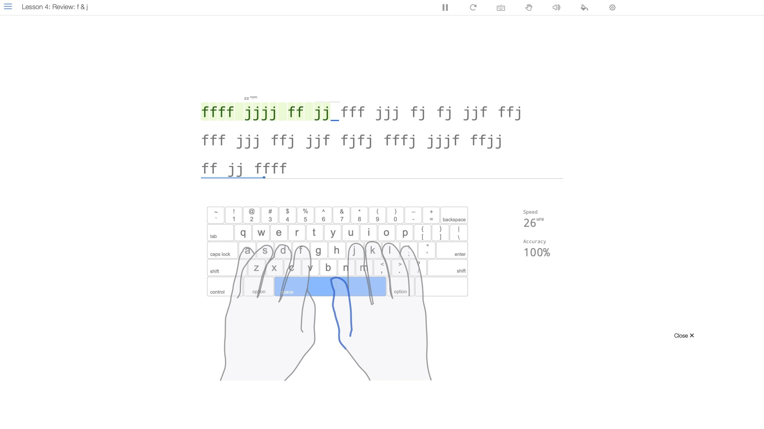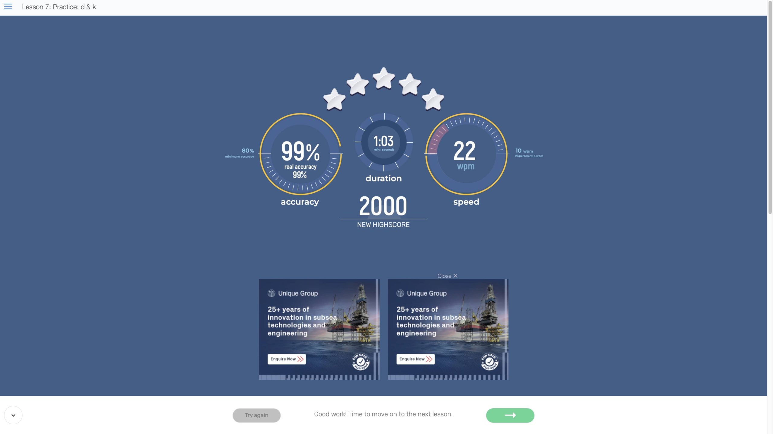 นอกจากนี้ยังมีคะแนนบอกให้ ว่าเราพิมพ์ไวแค่ไหน แต่ถ้าคะแนนต่ำไปต้องเล่นบทเรียนนั้น ๆ ใหม่เพื่อผ่านสู่บทเรียนต่อไปนะ