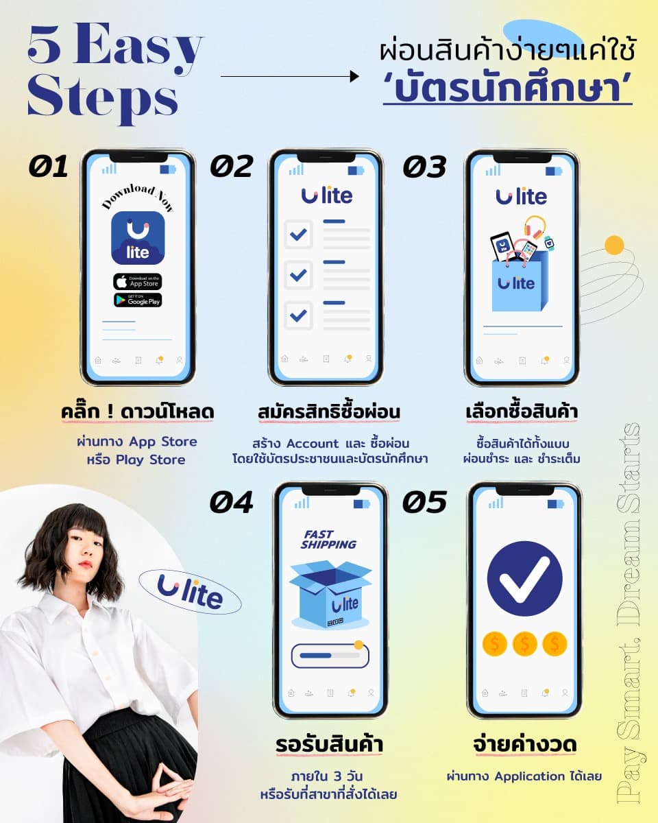 น้อง ๆ นักศึกษาสามารถผ่อนชำระได้สูงสุดนาน 18 เดือน สมัครง่าย รู้ผลไว มีแค่บัตรประชาชนและบัตรนักศึกษาก็สมัครขอสิทธิซื้อผ่านแอป Ulite ได้ง่าย ๆ รู้ผลทันทีใน 1 วันทำการ จากนั้นก็เข้าไปเลือกซื้อและผ่อนสินค้าที่ต้องการได้เลย