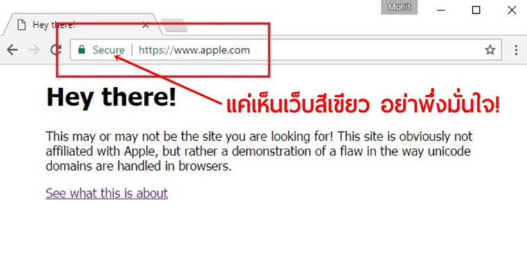 ซึ่งเท่ากับว่าหากเราโดนหลอกให้คลิกผ่านลิงค์ ยกตัวอย่างอันนี้ (xn--80ak6aa92e.com) เราก็จะเด้งไปหน้าที่ Chrome, Firefox และ Opera แสดงผลเป็น apple.com (ทั้งที่มันคนละเว็บไซต์) แต่โชคดีที่หากใครใช้ Safari มันจะแสดงผลเป็นหน้าเว็บไซต์จริงคือ xn--80ak6aa92e.com