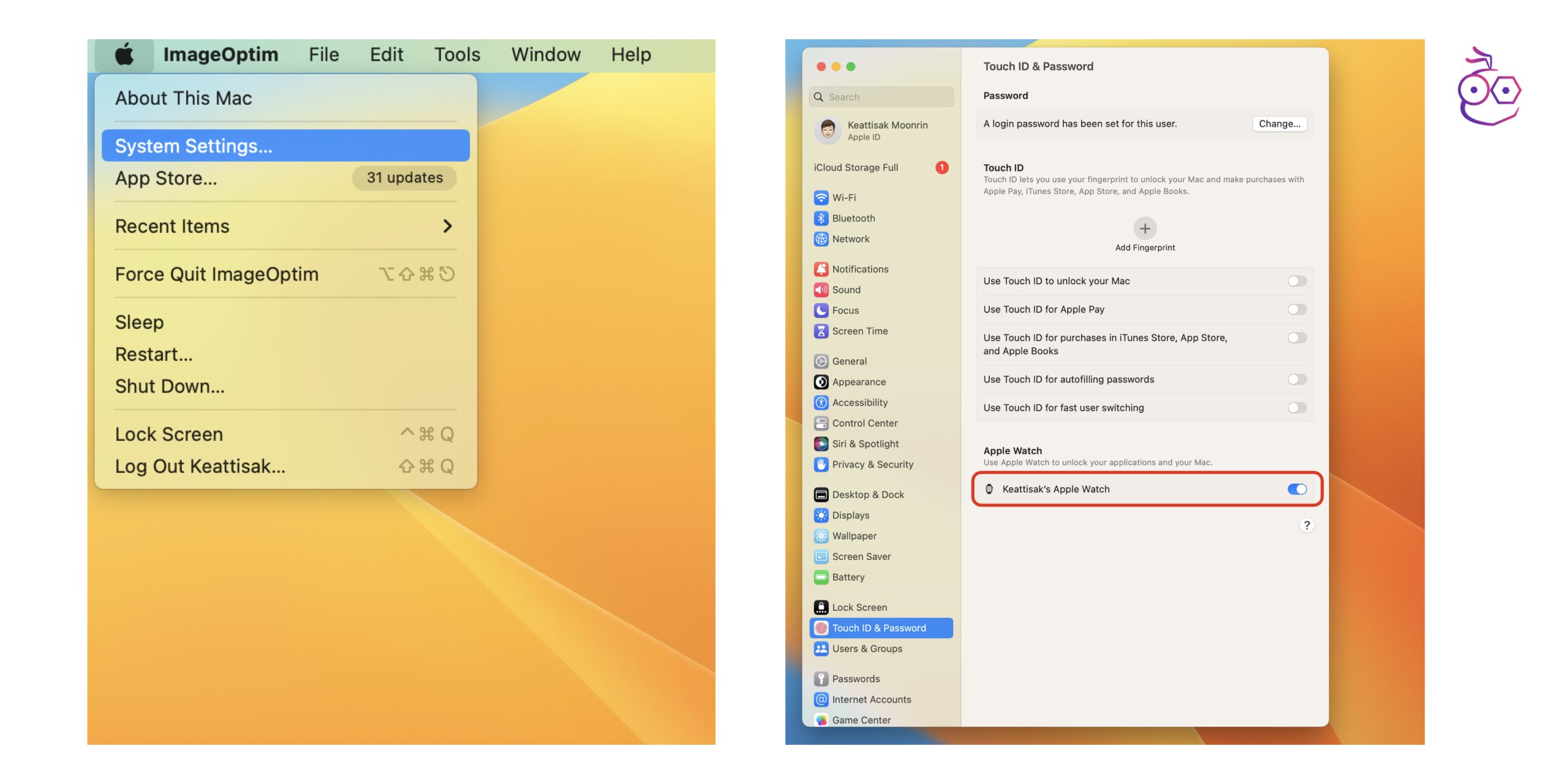 เข้าไปยัง System Settings > แถบ sidebar เลือก Touch ID & Password > จะมีตัวเลือกให้ปลดล็อคเครื่อง Mac ด้วย Apple Watch ทางด้านขวาให้เปิดใช้งาน