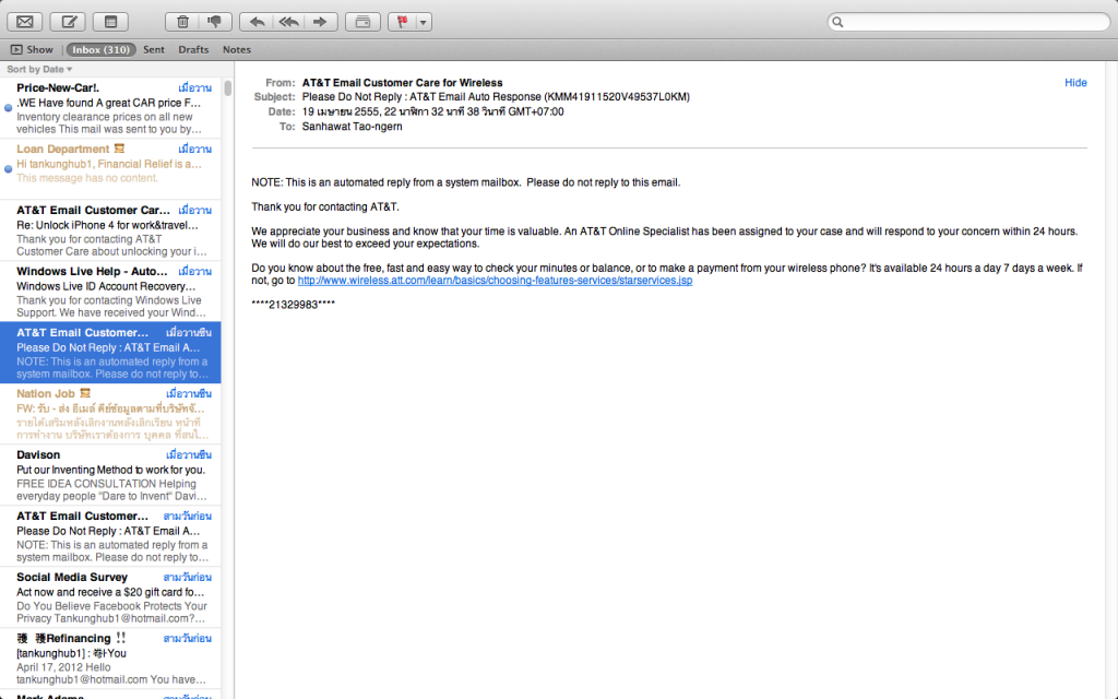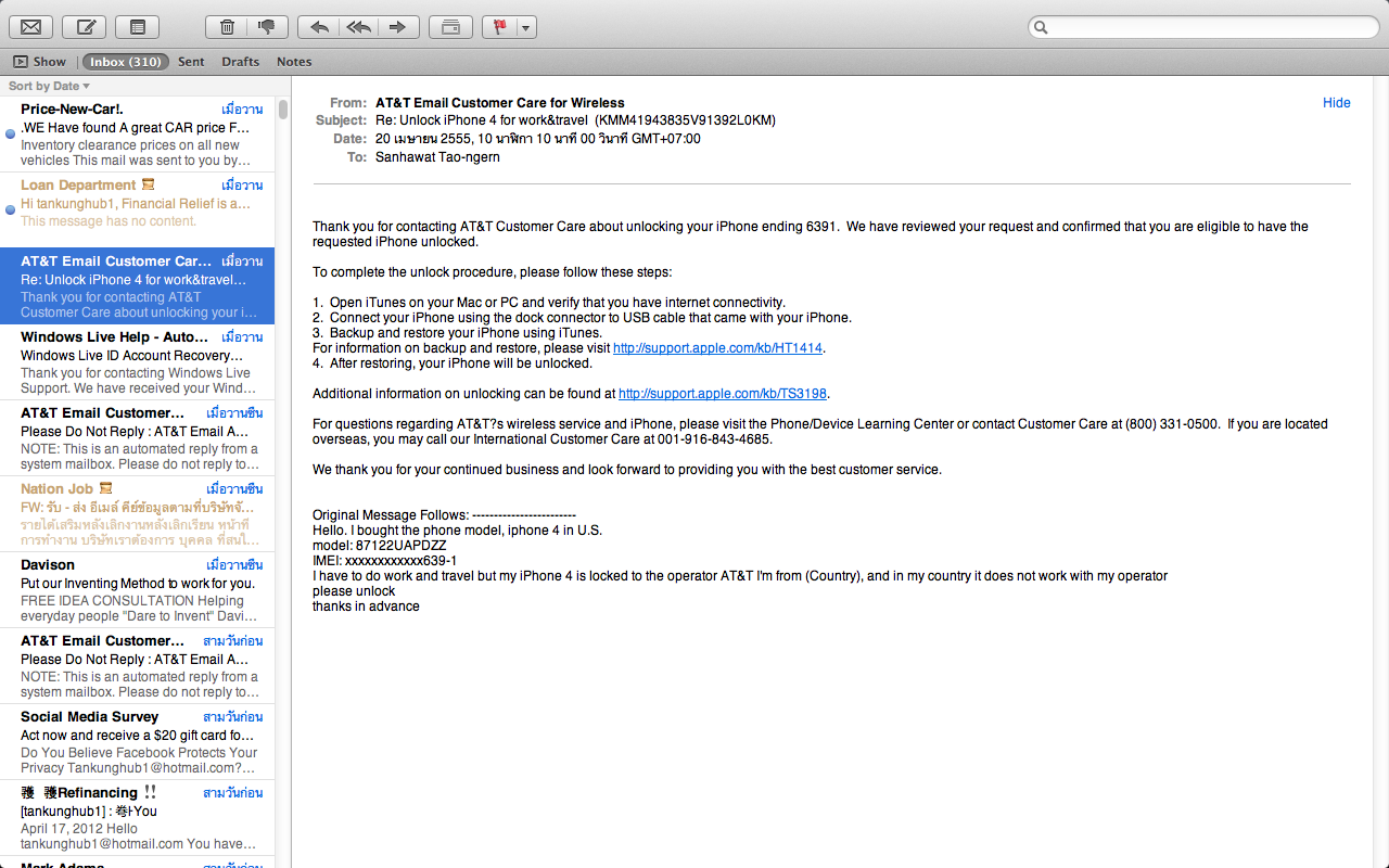 หากเครื่องของท่าน สามารถ unlock กับทาง AT&T ได้ ท่านจะได้รับเมล์แบบนี้มาครับ