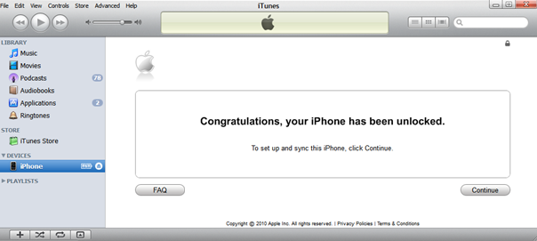 เมื่อได้รับ Email รูปแบบนี้มา ก็แสดงว่าเครื่องของท่านได้ทำการ ปลดล็อค กับทาง AT&T แบบถาวรไปแล้วเรียบร้อยครับ หลังจากได้รับ Email นี้แล้ว ไม่จำเป็นต้อง restore ก็ได้ครับ ครั้งแรก ให้ต่อกับ iTunes แต่ต้องต่อ internet ด้วยนะครับ แล้วจะมี error ที่ iTunes ขึ้นมา แต่ไม่ต้องสนใจครับ ให้ เอาซิมที่เราต้องการจะใช้ใส่เข้าไปครับ ซักพัก ที่ iTunes จะมีข้อความขึ้นมาว่า “Congratulation your iphone was unlocked “