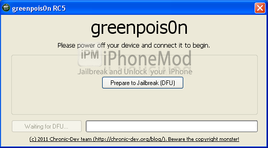 2. ต่อไอโฟนเข้าคอมและเปิด GP RC5 ขึ้นมา แล้วคลิกที่ Prepare to Jailbreak (DFU) จากนั้นจะได้รูปดังด้านล่าง
