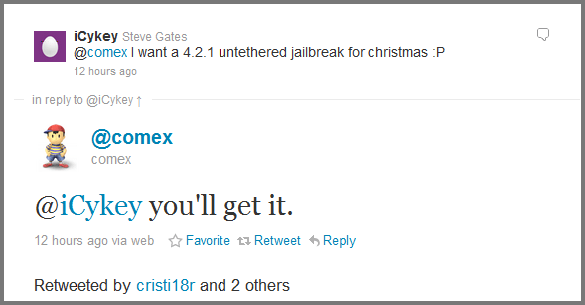 ล่าสุดจากทวีตของผู้ใช้คนนึงที่ีถามไปยัง Comex ว่า “ฉันอยากได้ Untethered Jailbreak วันคริสมาสต์นี้” ทางฝั่ง Comex ก็ตอบกลับมาว่า “ได้เลย วันคริสมาสต์จัดให้ ^^”