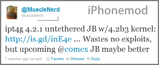 ipt4g 4.2.1 untethered JB w/4.2b3 kernel:http://is.gd/inE4e … Wastes no exploits, but upcoming @comex JB maybe better