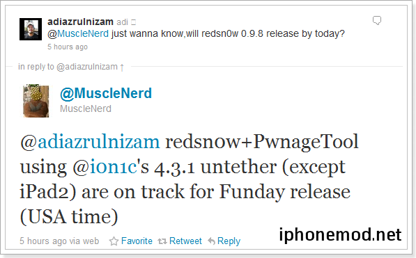 จากการพูดคุยผ่านทาง twitter ของเหล่า iPhone Dev Team นำโดยพี่นักกล้าม @muscleNerd ได้ออกมาทวิตตอบคำถามที่มีคนส่งไปถามว่า redns0w สำหรับ jailbreak ios 4.3.1 นั้นจะออกเมื่อไหร่ตอนไหนก็ได้คำตอบออกมาดังนี้ว่า