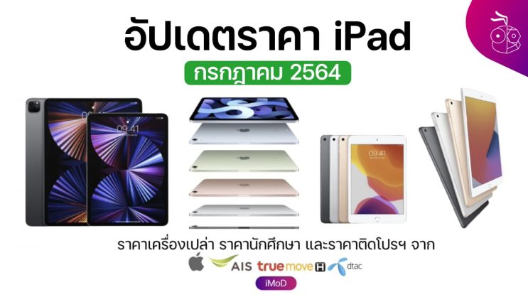 ข้อมูลนี้จะแสดงราคา iPad ที่วางจำหน่ายแต่ละรุ่น จาก Apple, TrueMove H, AIS และ Dtac ประจำเดือนกรกฎาคม 2564 (2021) ในบทความนี้มีทั้งราคาปกติ ราคาโปรโมชันและราคาสำหรับนักศึกษา สามารถดูรายละเอียดเพิ่มเติมได้เลย
