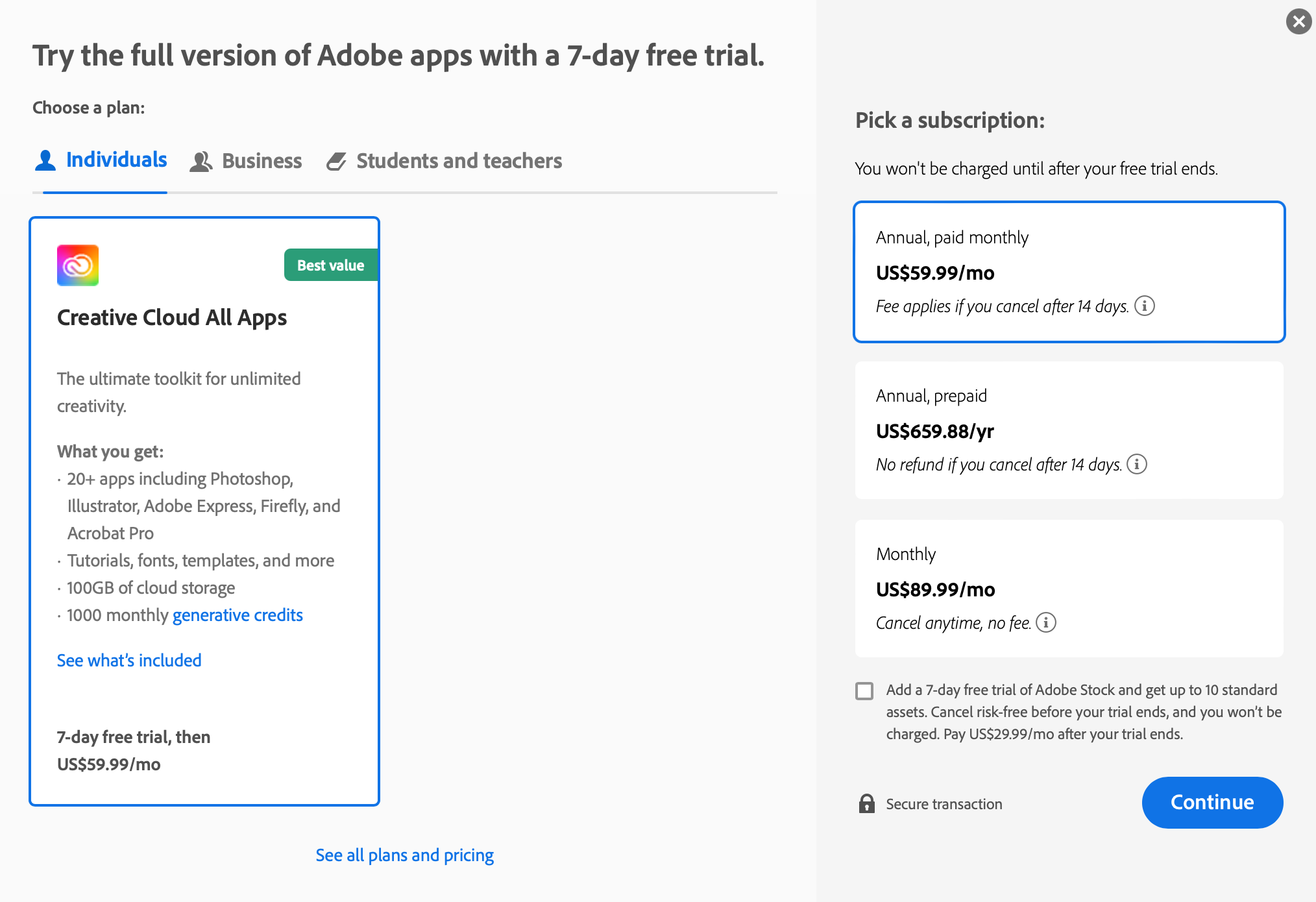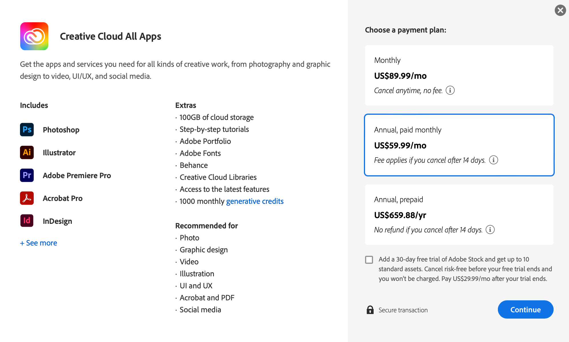 แผนบริการที่ Adobe แนะนำนั้นจะเป็นแบบ “รายปี จ่ายเป็นเดือน” ตกอยู่ที่ 60 ดอลลาร์ต่อเดือน (1,143 บาท) แต่มีเงื่อนไขว่า จะมีค่าธรรมเนียมหากยกเลิกหลังจากเปิดใช้แล้ว 14 วัน, ส่วนแผนบริการแบบ “รายเดือน จ่ายเป็นเดือน” ที่สามารถยกเลิกตอนไหนก็ได้นั้นอยู่ที่ 90 ดอลลาร์ต่อเดือน (3,317 บาท) ซึ่งแพงกว่า และแผนแบบ “รายปี จ่ายเป็นปี” อยู่ที่ 660 ดอลลาร์ต่อปี (13,725 บาท) หารมาแล้วดูว่าถูกสุด แต่ Adobe จะไม่คืนเงินหากผู้ใช้ยกเลิกหลังจากเปิดใช้แล้ว 14 วัน