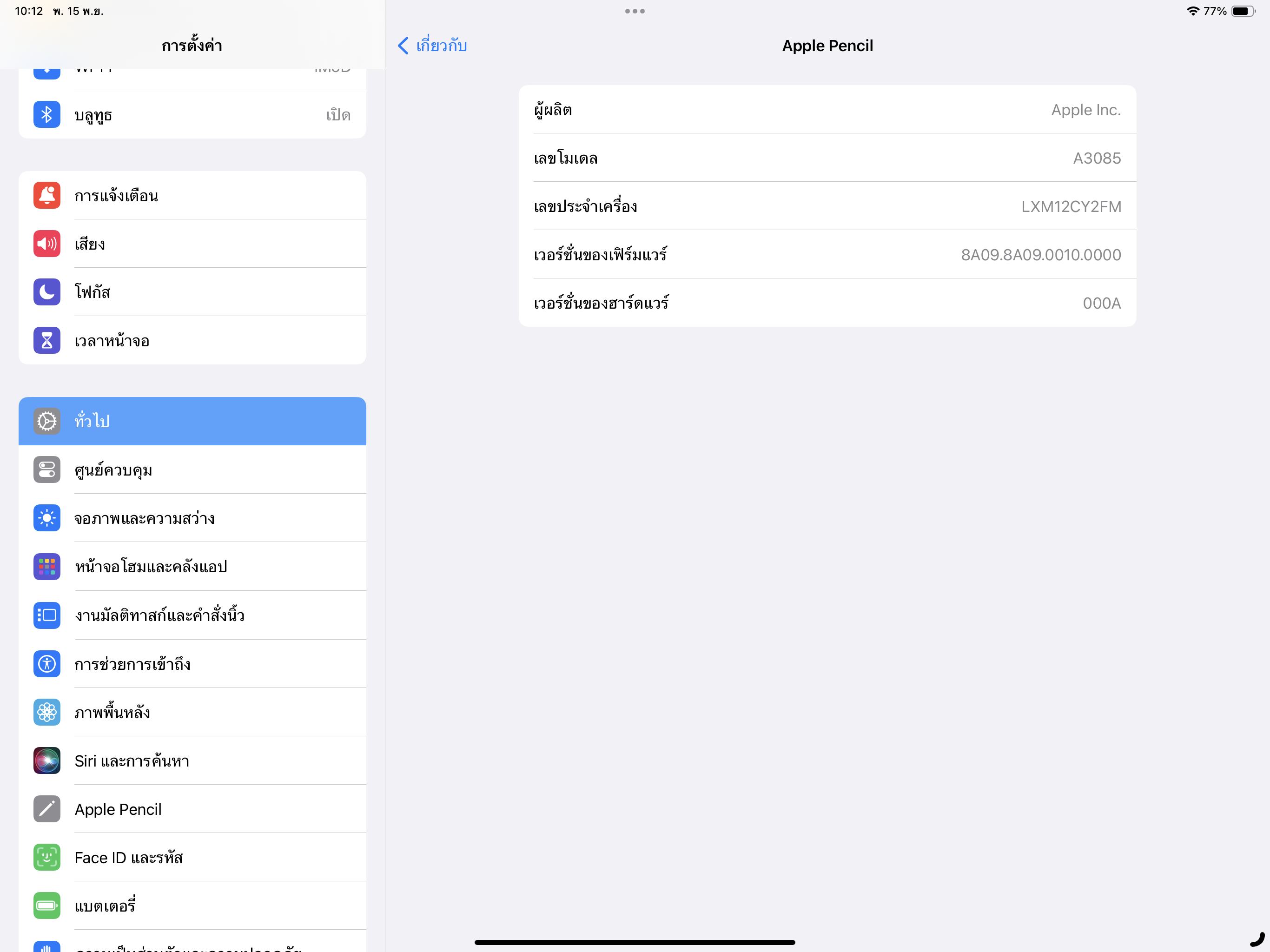 สามารถตรวจสอบเลขเวอร์ชัน Firmware ของ Apple Pencil ได้ที่ การตั้งค่า > ทั่วไป > Apple Pencil