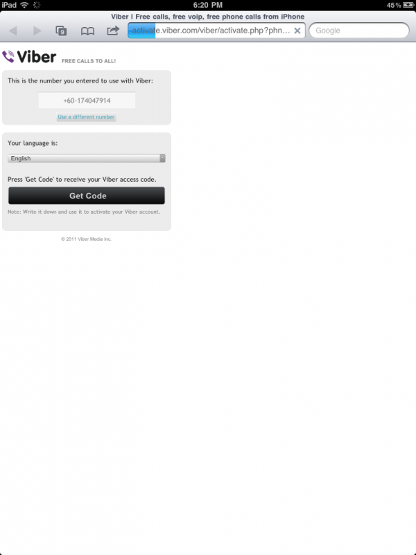 จากนั้นจะเข้าสู่หน้าเว็บแล้วก็กด Get Code แล้วรอสายนะจากนั้นจะมีระบบอัตโนมัติโทรมาหาตามเบอร์เราที่ใช้ไว้เพื่อจะบอก code ตัวเลข 4 หลักสำหรับการนำมา activate ให้ Viber ใช้งานได้