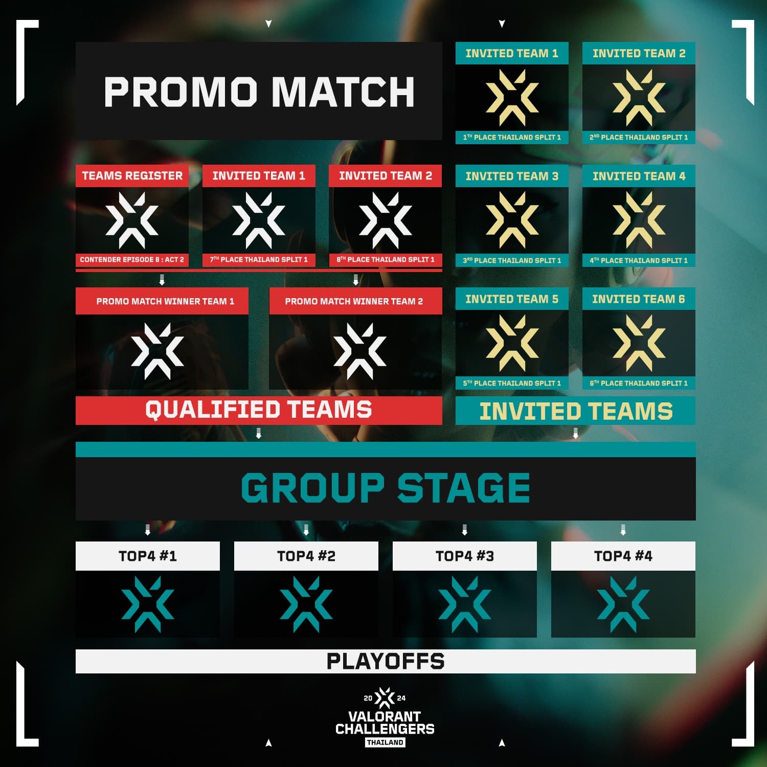 - รอบแรก Promo Match 14 ทีมจากการสมัครเข้ามาจากทีมที่ในดิวิชั่น Contender ของ Premier ใน Episode 8 : Act 2 รวมกับ 2 ทีม Invited Promo Match (Barn Nong Chok, The Infinity Esport) ทำการแข่งขันหา 2 ทีมที่ดีสุด ผ่านเข้าสู่รอบ Group Stage VALORANT Challengers 2024: Thailand Split 2