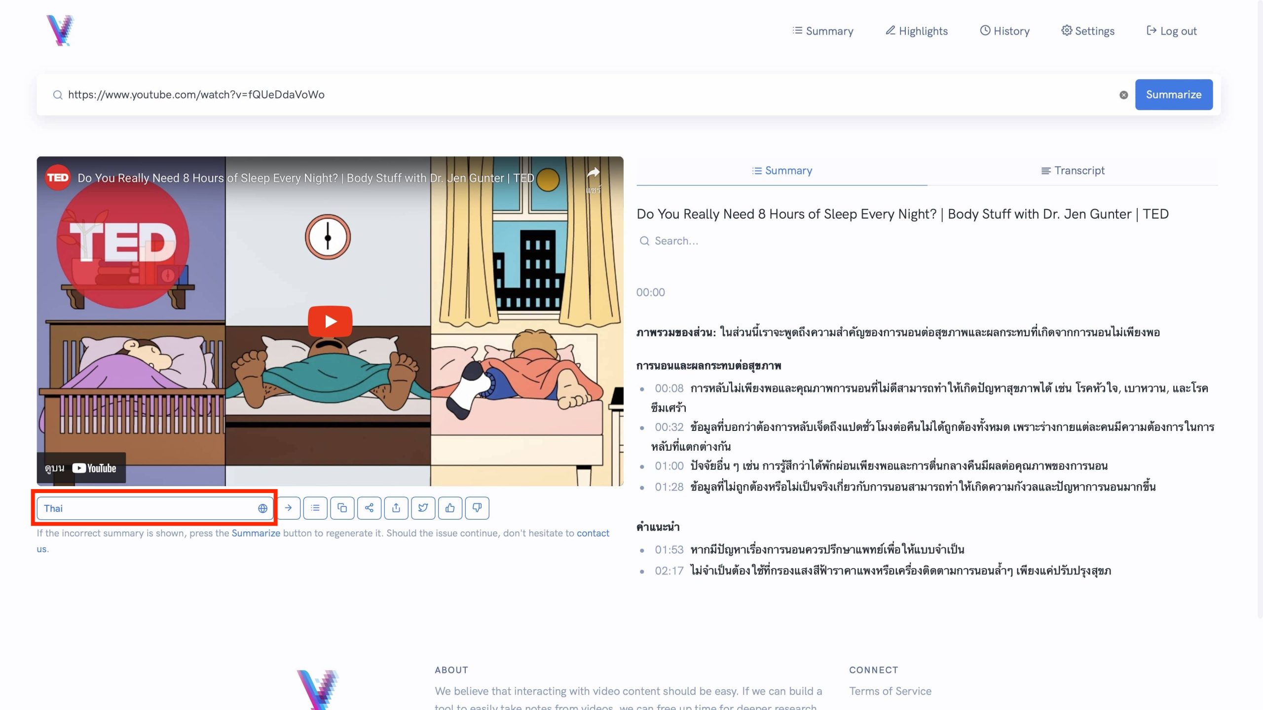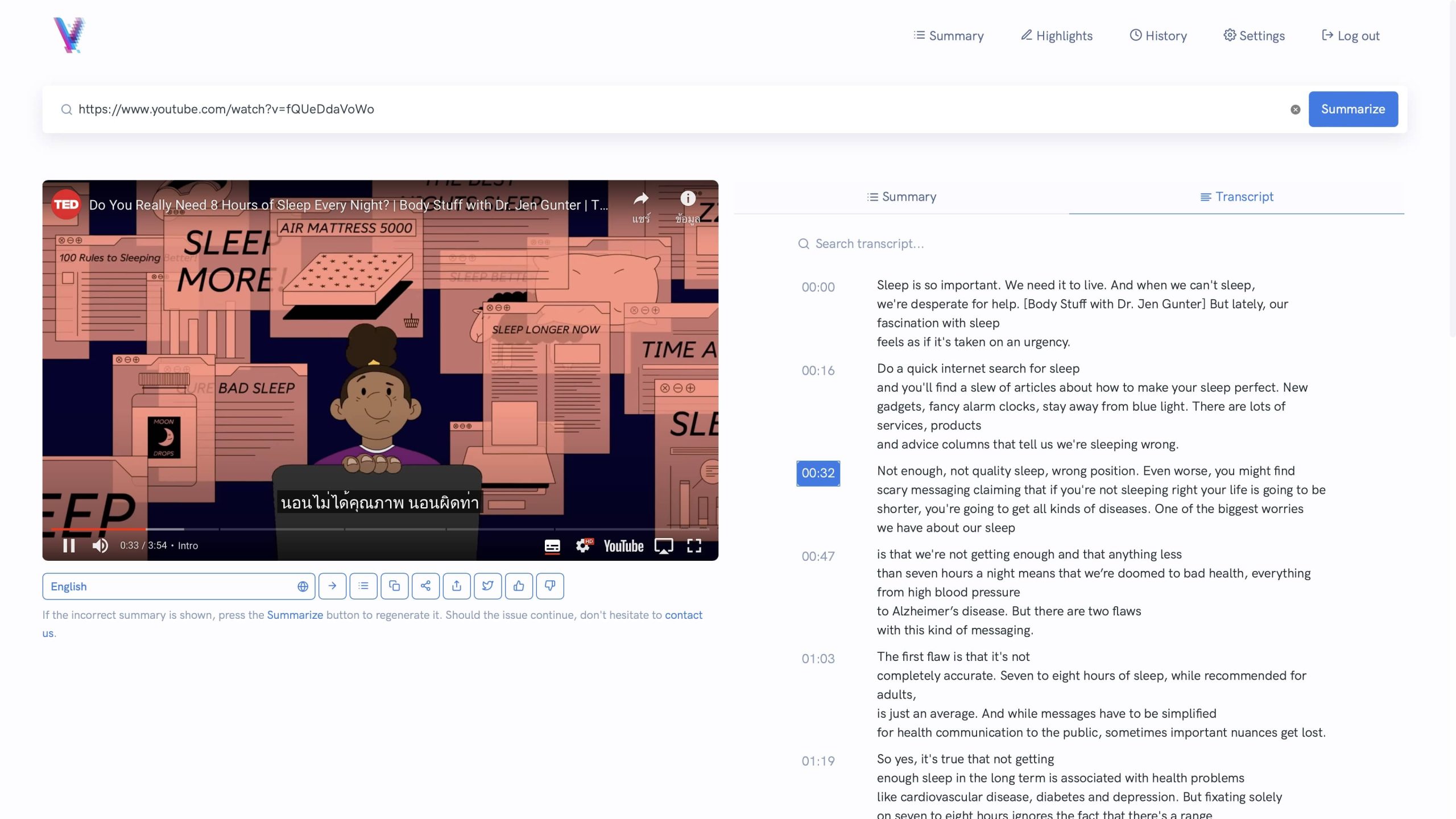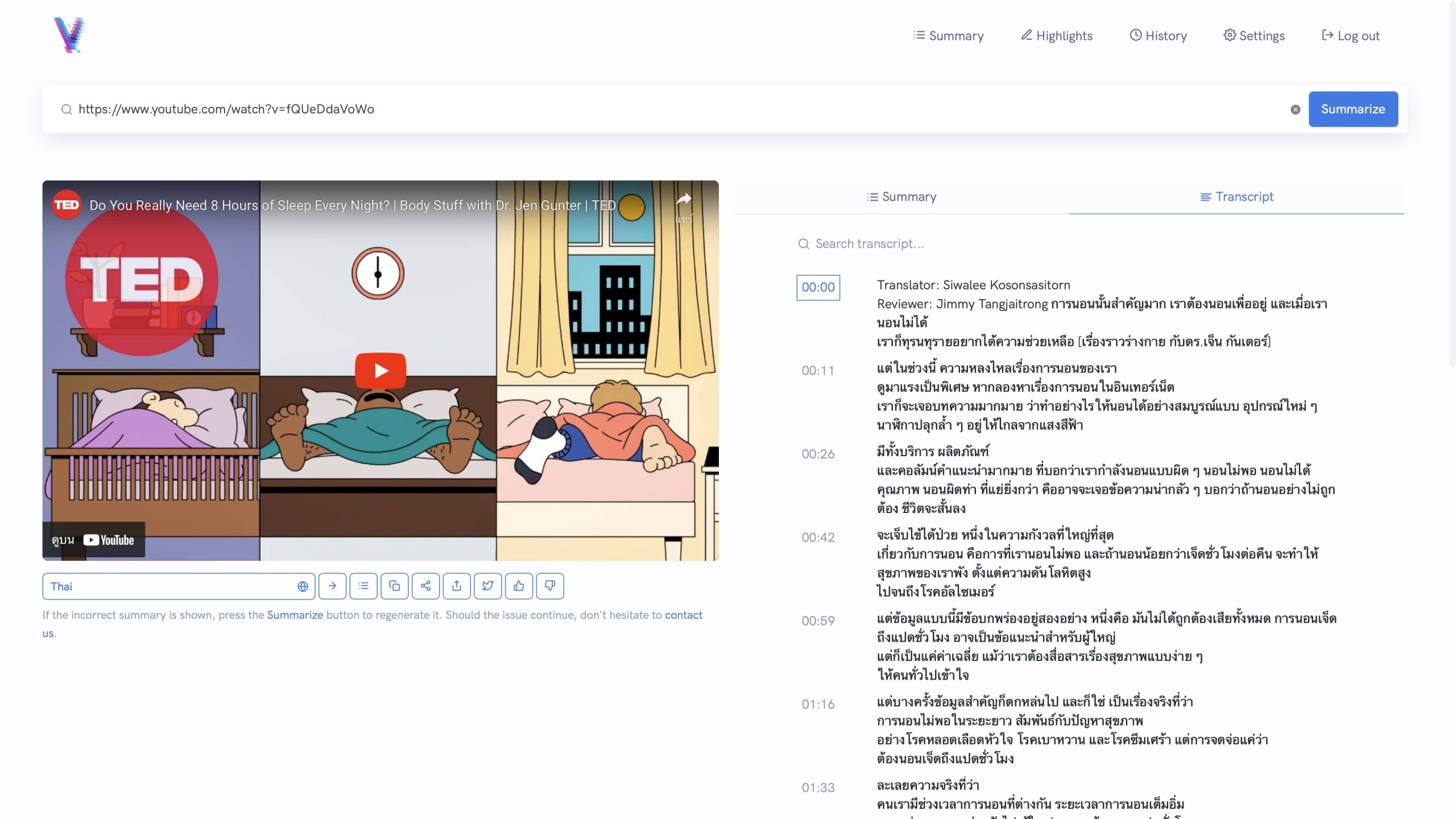 และยังมีโหมด Highlight ที่สามารถดูได้ทั้งสรุป และ Transcript ได้อีกด้วย ซึ่งทำให้สะดวกมากขึ้นถ้าอยากจะดูทั้งสองอย่างไปพร้อมกัน